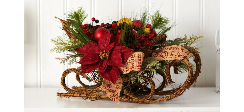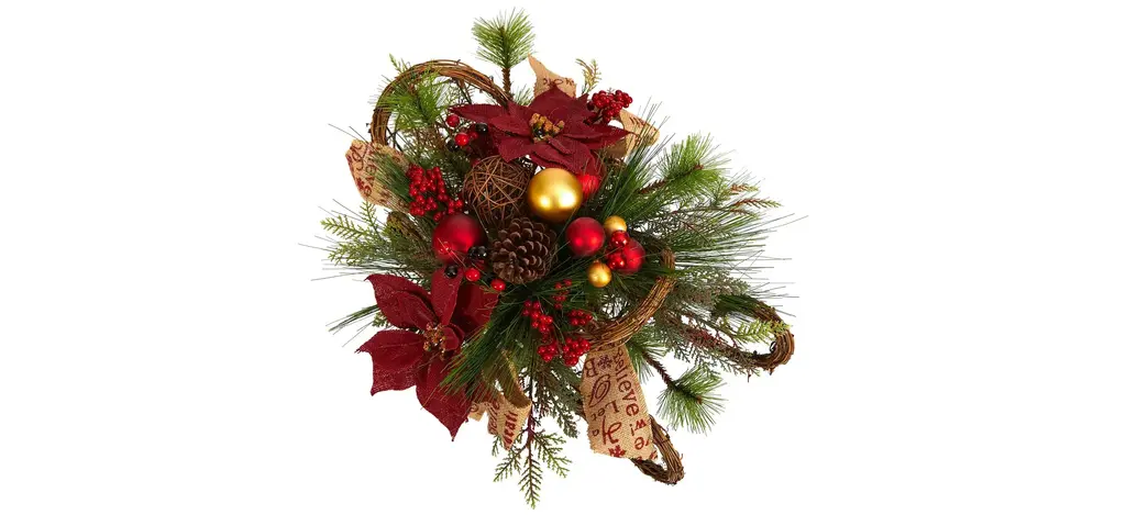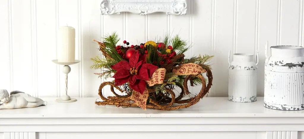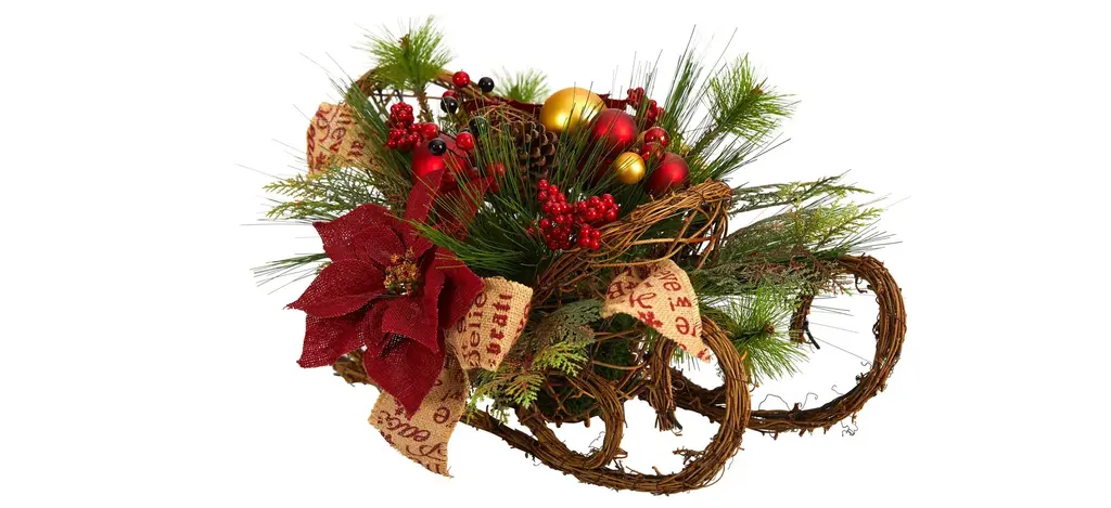Make a winter wonderland inspired statement with this 18" Sleigh with Holiday Foliage Artificial Arrangement. Artificial poinsettias, berries, and pinecones sit on a bed of evergreens and are accented by ornaments. Inspired by nature and crafted from high-quality materials, this arrangement will last for many holiday seasons. With a length of 18", house in any space in need of Christmas cheer. Your arrangement will look beautiful for years to come; simply wipe clean with a soft dry cloth when needed.
