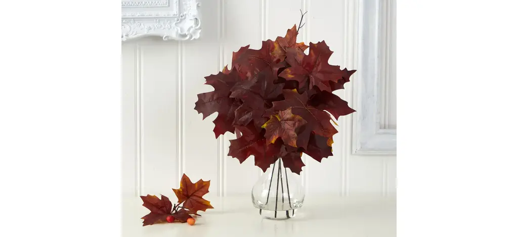 When you think of the perfect autumn landscape, the picturesque fall foliage is top of mind. Now you can craft your own spectacular scenery with this Maple Leaf artificial plant. Inspired by the North American forests, we designed your plant with naturally occurring details and vibrant shades of variegated perfectly, imperfect leaves mimicking the fall foliage. Standing at 18" wide from a clear vase, showcase mother nature's beauty during the Thanksgiving dinner table, Halloween or cozy nights. Perfect for a family fun DIY fall design session. Silk plants are manufactured using synthetic materials, such as polyester material or plastic, and are well designed and constructed to be life-like in appearance. This item will need to be re-shaped when removed from the secure box to allow it to reach its fullest size. Your artificial plant will look beautiful for years to come; simply wipe clean with a soft dry cloth when needed.
