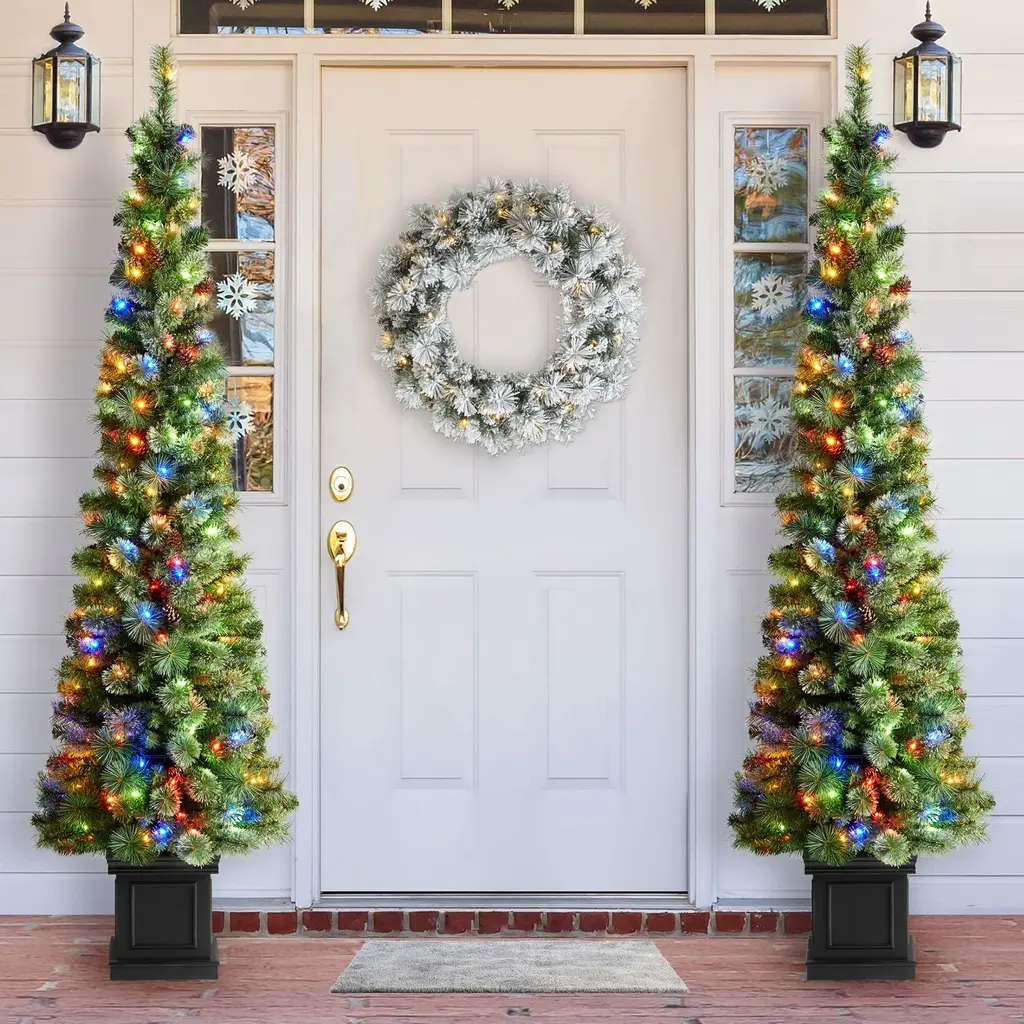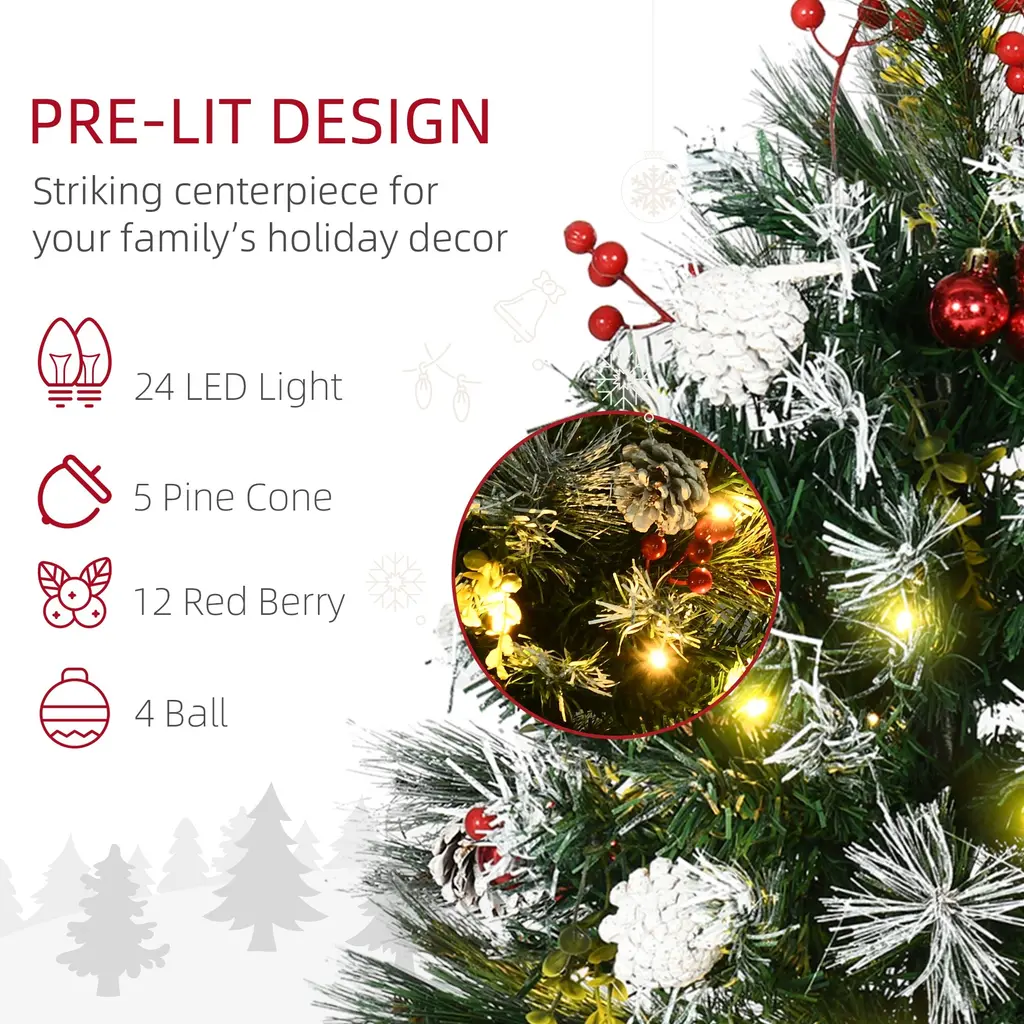 2.5 Ft/30" 2 Pack Outdoor Entryway Xmas Tree Cordless With 70 Branches, Warm Led Lights, Red Berries, Pine Cones, Balls, Green - Green