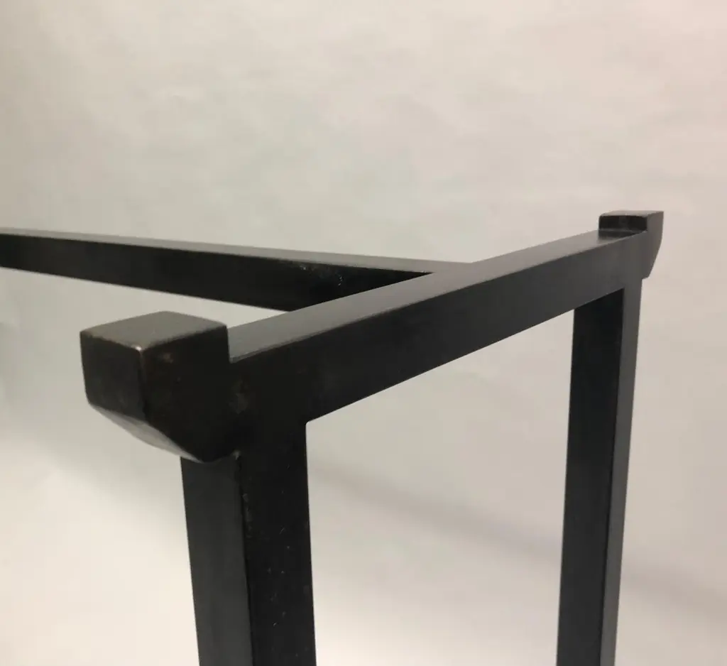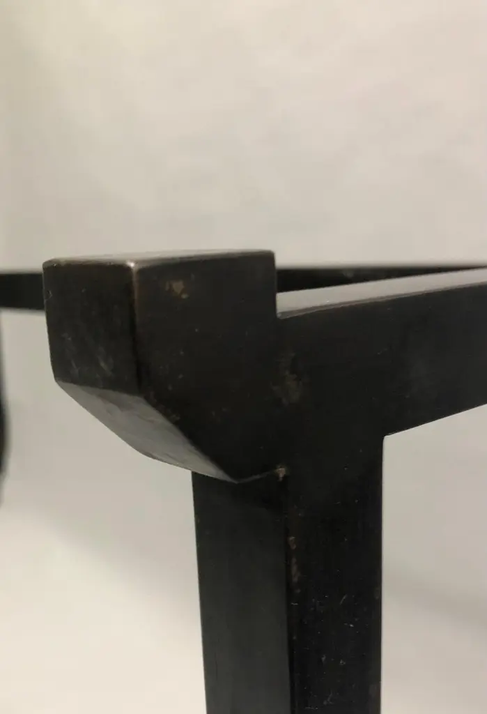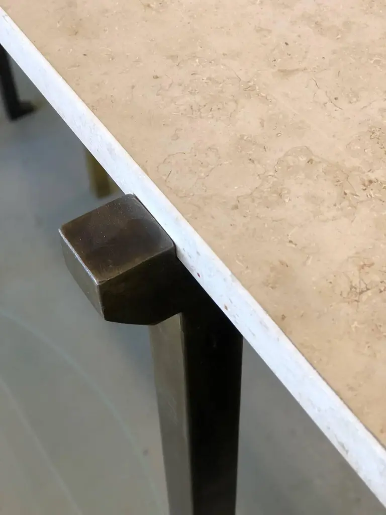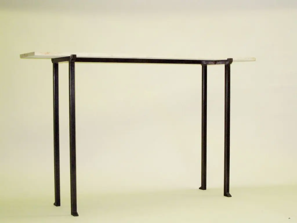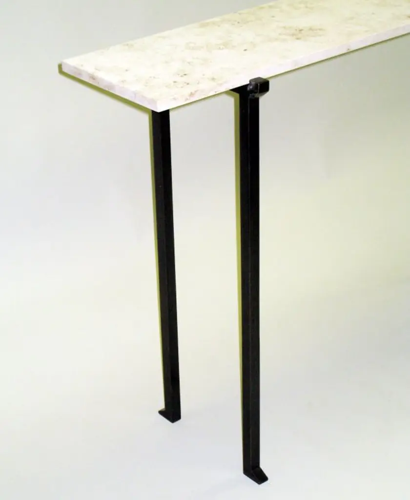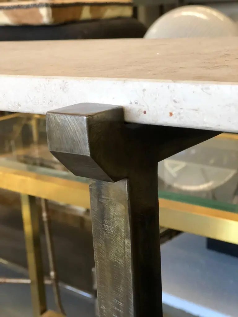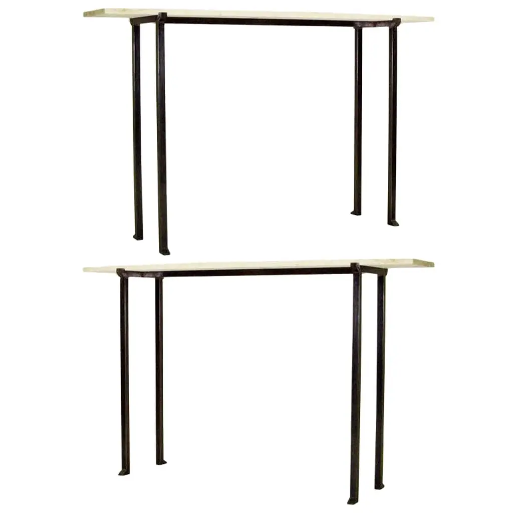 2 Elegant French mid-century style consoles or sofa tables in the modern neoclassical spirit with bronzed wrought iron bases and limestone tops. The tops of the bronzed iron frames are delicately notched for the stone to fit securely and the feet are delicately splayed creating a composition of ultimate sober refinement. Priced and sold as individual pieces. Custom pieces are available.