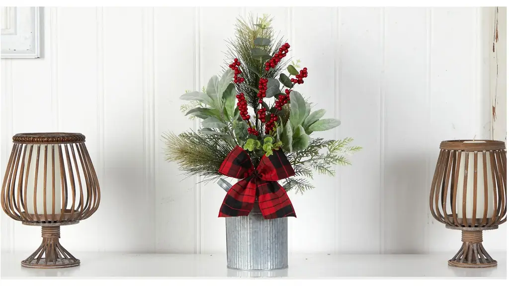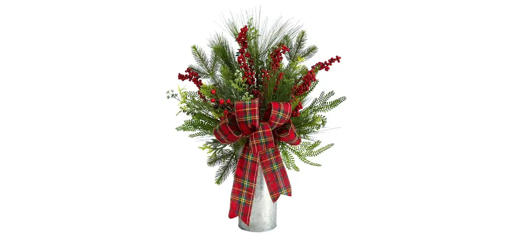 It's the most wonderful time of the year with this 20" Holiday Foliage Artificial Arrangement. Realistic-looking berries and pine evoke a winter wonderland full of holiday cheer. Standing at 20", this piece arrives in a tin vase for a cozy, rustic-inspired modern farmhouse look. Style this piece in the living room, kitchen, or set on the Christmas dinner table for a berry nice touch. We guarantee this will be a favorite. Your arrangement will look beautiful for years to come; simply wipe clean with a soft dry cloth when needed.