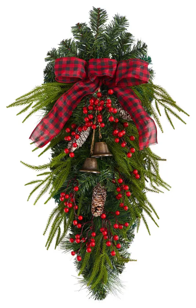 Make your traditional Christmas dreams come true with this Christmas artificial teardrop. Full of rich colored evergreens and accented by pinecones and berries, two small bells hang from the checkered bow at the center. Crafted from high-quality materials, display in an area in need of some Christmas cheer. With a height of 30in., house in any bare wall or door. It makes a fine gift as well. Artificial swags are manufactured using synthetic materials, such as polyester material or plastic, and are well designed and constructed to be life-like in appearance. This item will need to be re-shaped when removed from the secure box to allow it to reach its fullest size. Your artificial plant will look beautiful for years to come; simply wipe clean with a soft dry cloth when needed.