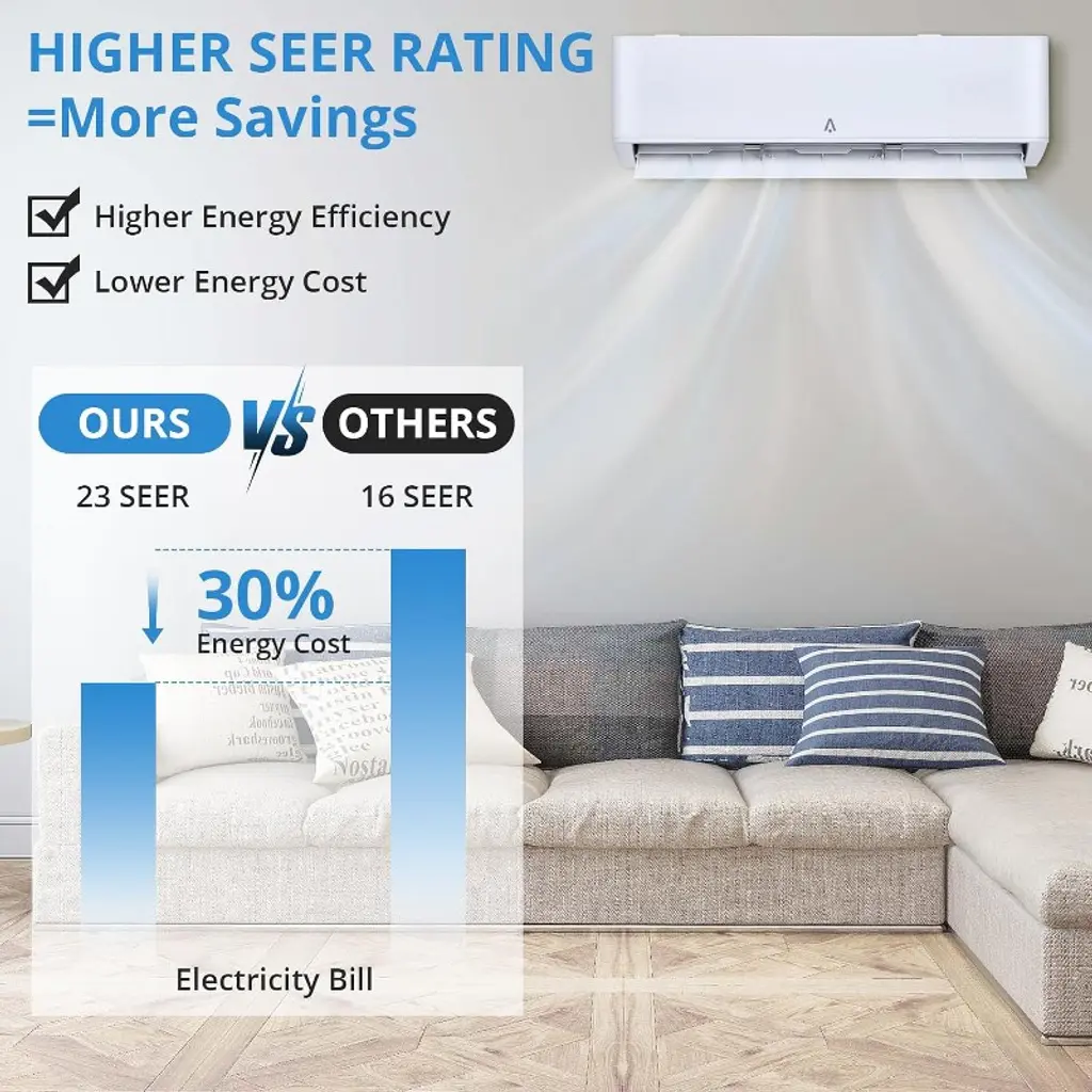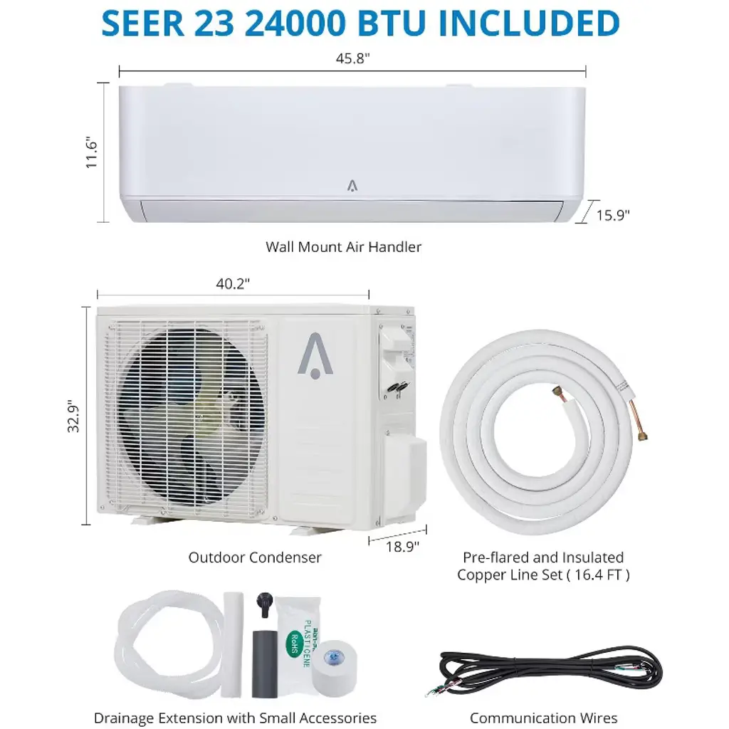 The item type is Ductless Mini-Split with Heat Pump , Model is Inverter Ductless Air Conditioner With Heater System , Timer Control is 24 Hours , System Configuration is Multi-Positional , Power Source is Corded Electric , Items Included Drain Hose, Duct Kit, Remote Control , Smart Home Compatibility is Amazon Alexa, Google Assistant, Other popular virtual assistants , Control Style is App Control, Remote Control , Compressor Type is Rotary & Impeller , Features is Adjustable Humidistat, App Compatibility, Dehumidifier, Digital Display, Eco-Friendly, Indoor, Programmable, Sleep Mode, Smart Connectivity, Timer,Package Include:1x Installation and Owner's Manual / 1x Warranty Card / 1x 16 ft. Communication Cable / 1x 16 ft. Insulated Copper Pipe / 1x Remote Controller / 1x Remote Controller Holder / 2x Remote Controller Batteries / 1x Indoor Unit Mounting Plate / 1x Set of Mounting Plate Screws / 1x Plastic Drain Joint Plug / 1x Condensate Drum. Type: cooling&heating Power supply: 208/230V~/60Hz/1P Rated Cooling(95F/35C) Rated cooling capacity (95F/35C) : 23000 Btu/h EER2 (95F/35C): 12.5Btu/W.h SEER2: 23 Btu/W.h Rated Heating capacity(47F/8.3C): 24000 Btu/h Rated Heating capacity(17F/-8.3C):14000 Btu/h Max. Heating capacity(19F/-7C): 18000 Btu/h Max. Heating capacity(5F/-15C):16000 Btu/h Percentage: 66.7% HSPF2 Rating (Region IV): 8.8 Btu/W.h HSPF2 Rating (Region V): 7.6 Btu/W.h COP2 (47F/8.3C): 3.5 W/W COP2 (5℉/-15℃): 1.8 W/W Rated Input Consumption:Cooling:1920 W / Heating:2050 W Rated Current : Cooling: 8.6 A / Heating:8.2 A Min. Circuit Ampacity: 19 A Max. Fuse size:30 A MXimum Operation Pressure:550 PSIG Moisture removal:2.6 Liters/h Indoor airflow: 1250/1050/900 m3/h; 735/618/529 CFM Indoor noise level:Turbo/High/Med./Low/Mute:51/48/43/38/35 dB(A) Outdoor airflow: 4500 m3/h; 2647 CFM Outdoor noise level:58 dB(A) Connecting Pipe : Gas: 5/8" inches / Liquid: 1/4'' inches Connecting Wiring:Size x Core number: 4×16 AWG Suitable area: Up to 1500 sq.ft Net dimensions (W x D x H): Indoor: 1100×333×222 mm; 43.31×13.11×8.74 inch Outdoor: 910 x 397 x 80.5 mm; 35.83 x 15.63 x 31.69 inch Net weight: Indoor: 14.0 kg/30.9 Ibs Indoor with all accessories: 15.0 kg/ 33.1 Ibs Outdoor: 47.5 kg/104.7 Ibs Outdoor with 5m pipe: 49.5kg/ 105.1 Ibs