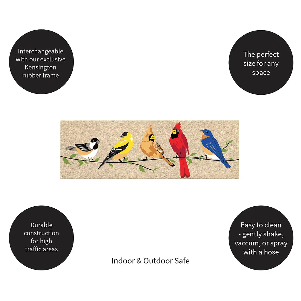 Greet guests in style with this Birds on a Branch Kensington Switch Mat. Crafted from coco husk fiber, the high-quality mat is natural and eco-friendly. It is ideal for high-traffic areas because it traps dirt and debris to prevent messes from being tracked into your house. The interchangeable mat can be swapped out seasonally to keep your look fresh. We offer three rubber tray surround options that provide a sturdy base for the mat, all sold separately. Since the mat is crafted from natural coir, some shedding is to be expected. Shake off excess fibers or use a soft brush to gently sweep.