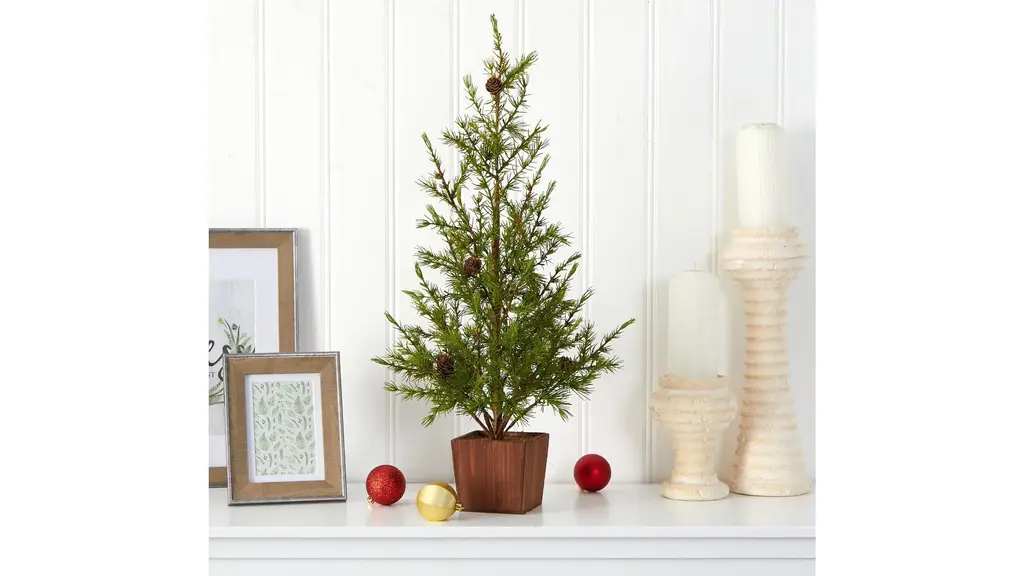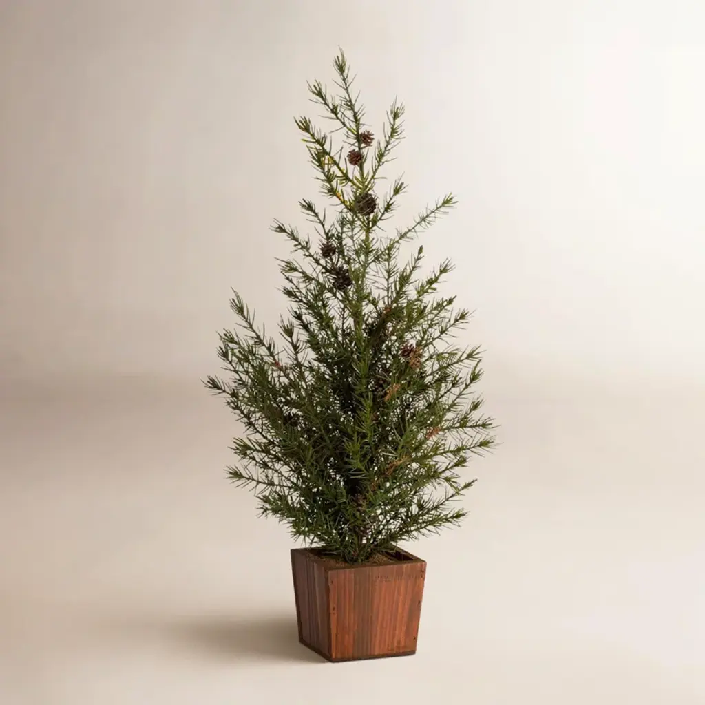 Evoke hints of the holiday spirit on bare surfaces with the help of this natural looking artificial Christmas tree. Sparse by design, this miniature Christmas tree boasts a collection of realistic looking pine foliage with bendable branches for easy and effortless decorating and accented throughout with tiny faux pinecones that look incredibly lifelike. Standing 28" high and stabilized in a wood planter, this artificial Christmas tree would undoubtedly make any space merry throughout the holiday season.