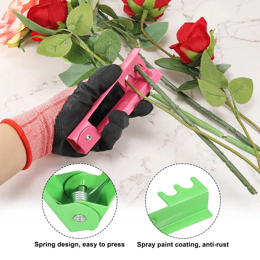 This thorn removal tool is great for use in the florist shop and for various gardening tasks. From pruning rose bushes to preparing bouquets, it simplifies the entire process by quickly and easily removing unwanted thorns and leaves.SpecificationColor: GreenMaterial: Plastic, MetalRubber Stripper Diameter: 12cm / 4.7 inchSteel Stripper Length: 14cm / 5.5 inchPacking List: 1pcs x Plastic Thorn Removal Tool, 1pcs x Metal Thorn Removal PliersAdvantageThe thorn remover tool is made of soft plastic material, which is durable and has a smooth surface that is easy to clean. Metal thorn remover can easily remove thorns and leaves from stems.InstructionPlace the rose stem in the middle of a plastic rose stripper or metal thorn remover and move it from top to bottom to easily remove thorns and leaves.NOTE: Avoid applying excessive force or using it on delicate flowers, as this may cause damage to the petals.