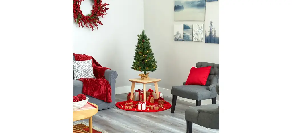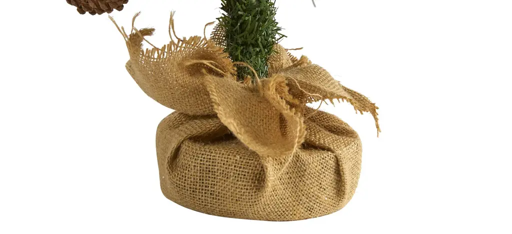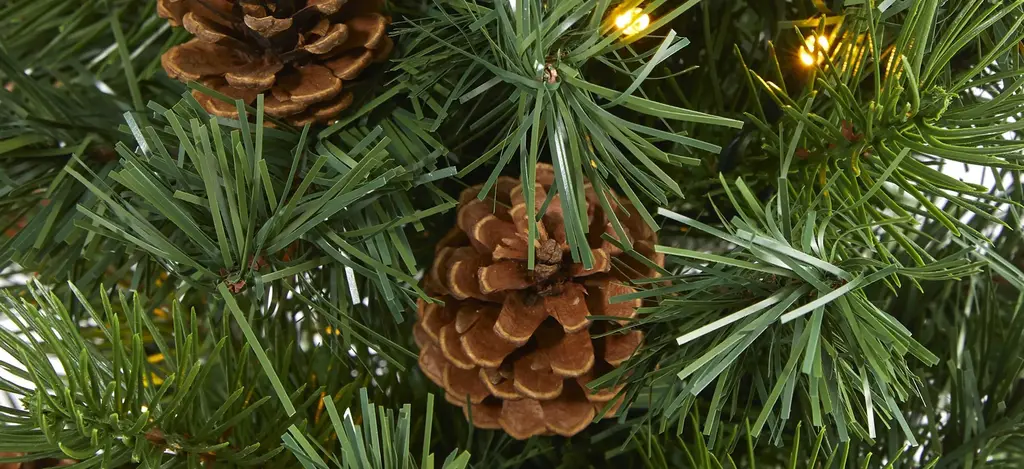 Create a traditional holiday scene with the help of this artificial Christmas tree! Completely maintenance-free, this realistic looking fake Christmas tree boasts a rich collection of seasonal evergreens for decorating with your own personalized ornaments and accented throughout with miniature faux pinecones that look incredibly lifelike. Arriving pre-strung with 50 LED lights to eliminate tangles and settled on a burlap-covered base, this versatile 3' tall artificial Christmas tree will not only make decorating a breeze but ensure your home is always seasonally attired for years to come.