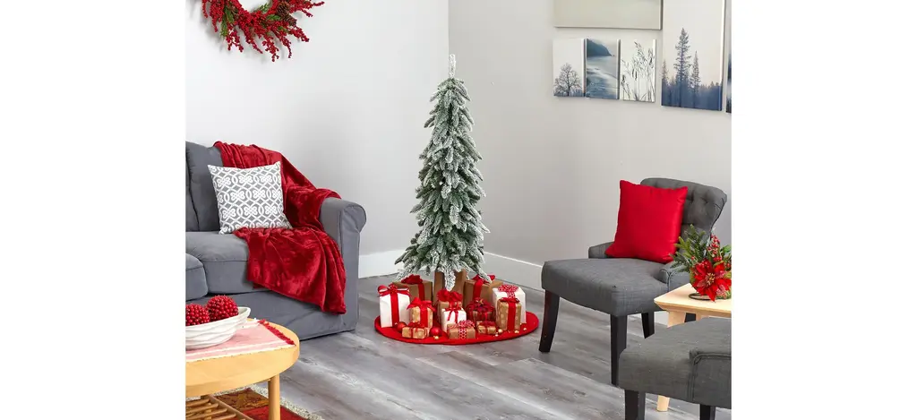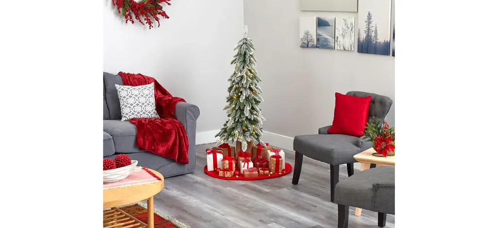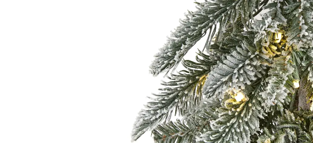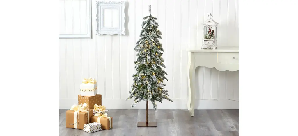 Set up the ultimate Christmas scene even in a limited space environment with the help of this flocked artificial Christmas tree. Completely maintenance-free, this winter-inspired artificial Christmas tree boasts a slim and slender silhouette made up of 285 easy-to-bend branches to showcase all your favorite holiday ornaments, all beautifully flocked in a winter coating of faux snow to evoke the impression of freshly fallen snow. Arriving pre-strung with 100 clear LED lights to eliminate unsightly tangles and carefully stabilized on an extended faux wooden pole and metal stand, this snowy 4.5' artificial Christmas tree will undoubtedly transform your holiday decor, year after year.