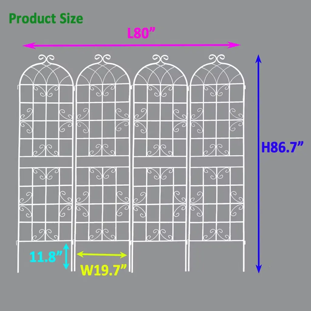 Description: Product Name: 4 Pack 86.7"x19.7" Metal Garden Trellis, Rustproof Wire Lattice Panel, Outdoor Flower Support Trellis For Climbing Plants Roses Vine Cucumbers Color: White Usage: Garden & Outdoor Material: Iron Packing list: 4 Pack 86.7"x19.7" Metal Garden Trellis, Rustproof Wire Lattice Panel, Outdoor Flower Support Trellis For Climbing Plants Roses Vine Cucumbers Assembly Instructions: https://b2bfiles1.gigab2b.cn/image/wkseller/18675/20230212_d672f682f1b52b4beabba6dc234c2241.jpg?x-cc=10&x-cu=25692&x-ct=1727334000&x-cs=5b2645a01f4392a571a13ee82057431b