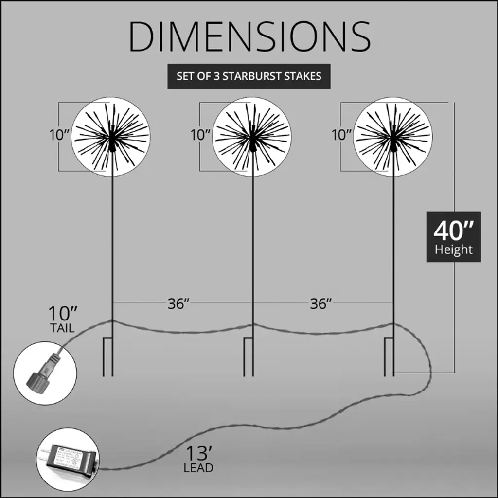 Starburst-lighted branches on stakes give you even more options for brightening up your outdoor and home decor. At 40 inches tall, they can add a vertical dimension to floral planters, or they can be staked along walkways and in the garden. The bendable silver branches add a festive touch, catching and reflecting the bright LED lights. Use starburst-lighted branch stakes to add a cozy atmosphere to your home or garden, and include them in special events and wedding decorations to create a fun atmosphere during your most exciting occasions!