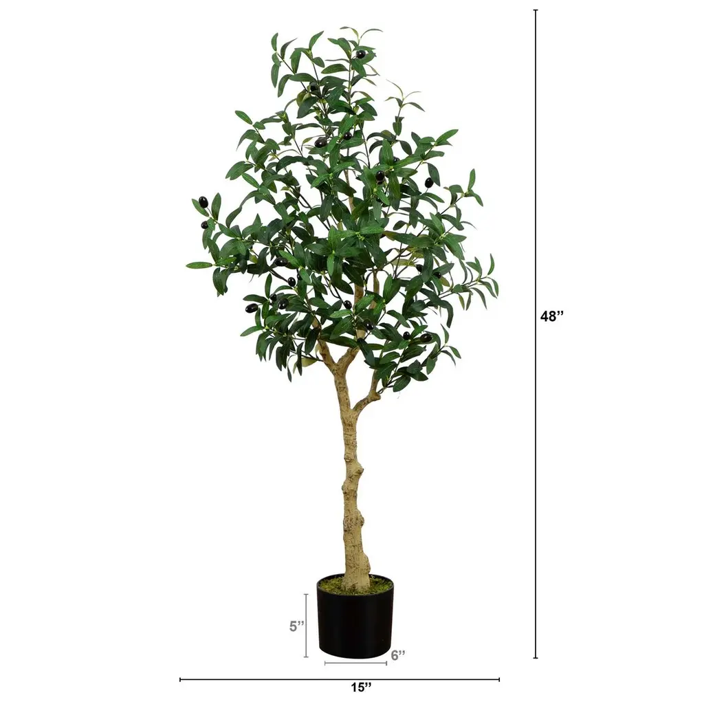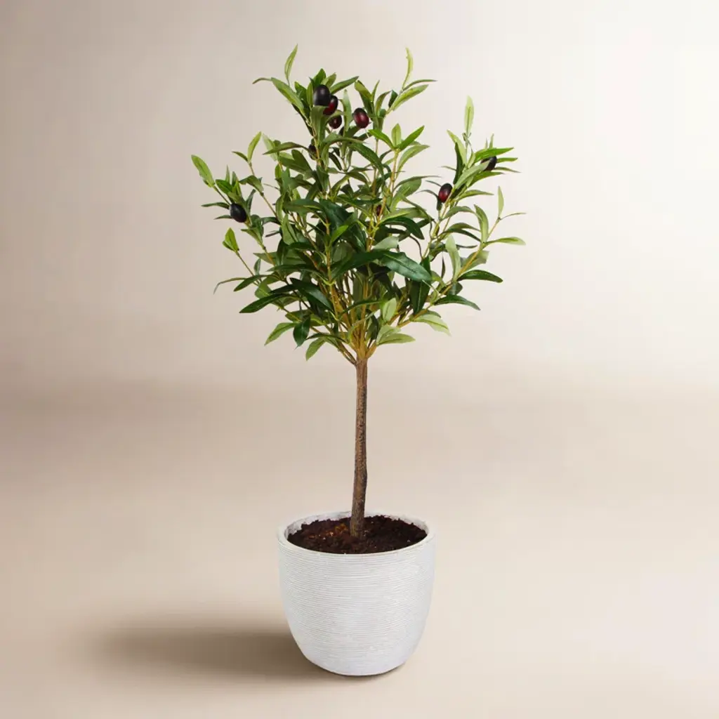 Get ready for the next big thing in home decor - our new olive trees! Inspired by the most famous tree on social media and its distant cousin from the Mediterranean, this tree is sure to impress. With lush leaves in varying shades of green and accents of faux olives, it adds a striking yet relaxed touch to any space. Crafted from high-quality materials by expert horticulturists, this is the perfect addition to any room and you can customize by bending the branches. Potted in a nursery planter, you can even customize it by placing it in your own decorative planter. For a cohesive look and feel, we offer them in many sizes, making them the perfect item to complete a home.