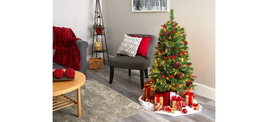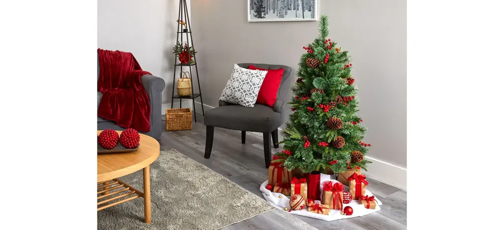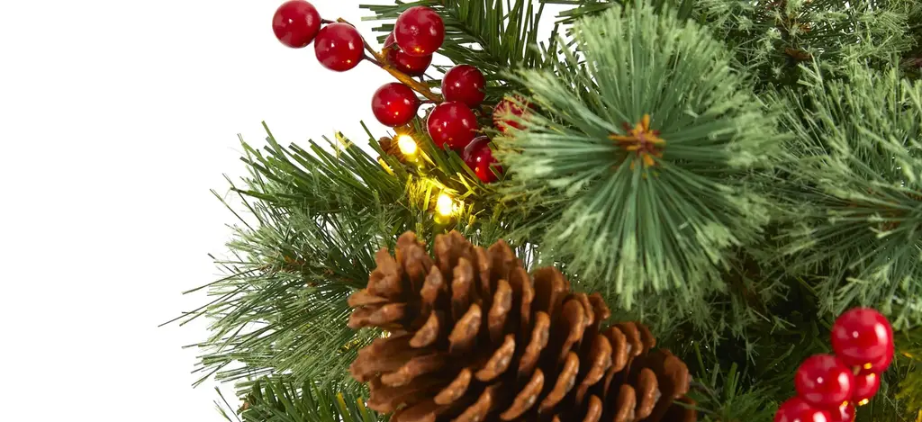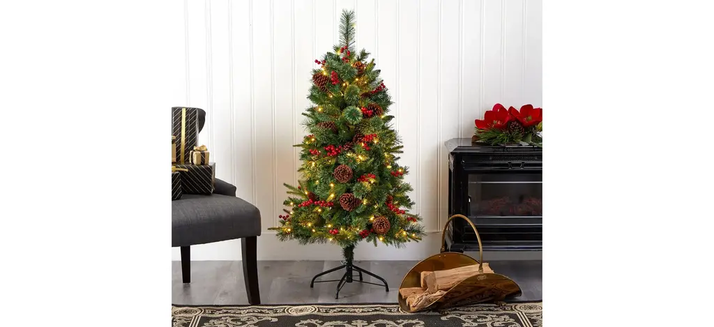 Create a picture-perfect Christmas setting in your home or office with this festive 4' pre-lit Norway mixed pine artificial Christmas tree. Easy to build and completely maintenance-free, this realistic looking Christmas tree boasts a mixed collection of pine foliage made up of 448 easy-to-bend branches, accented throughout with faux pinecones and holly berries that look incredibly realistic. Arriving pre-strung with 150 clear LED lights to eliminate tangles and carefully stabilized on a metal stand, this festive 4' tall artificial Christmas tree will not only make decorating a breeze but ensure your home is always seasonally attired for years to come.