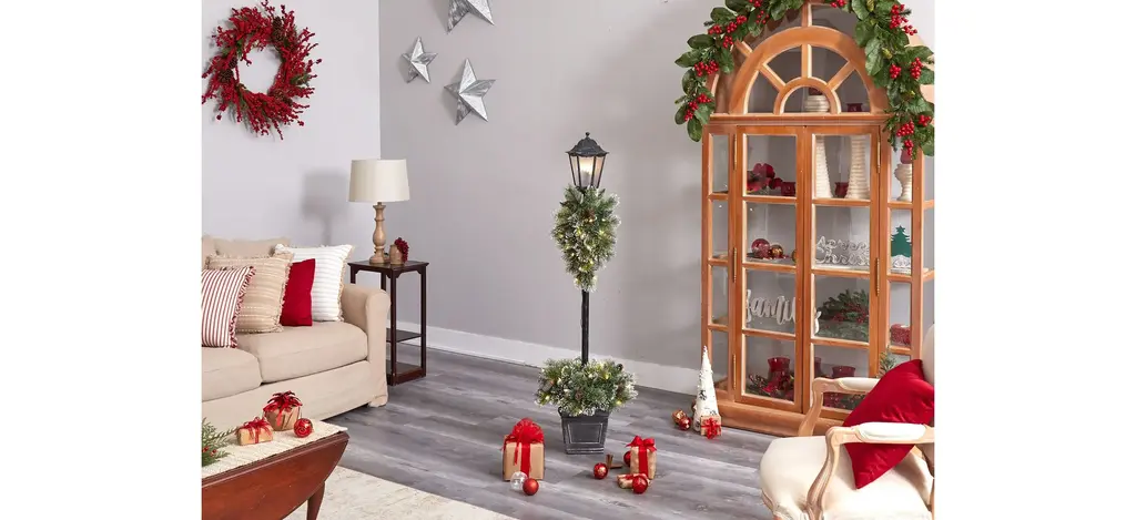 5' Holiday Pre-Lit Decorated Lamp Post With Artificial Greenery, Decorative Container