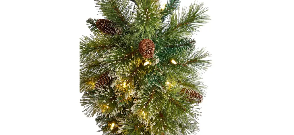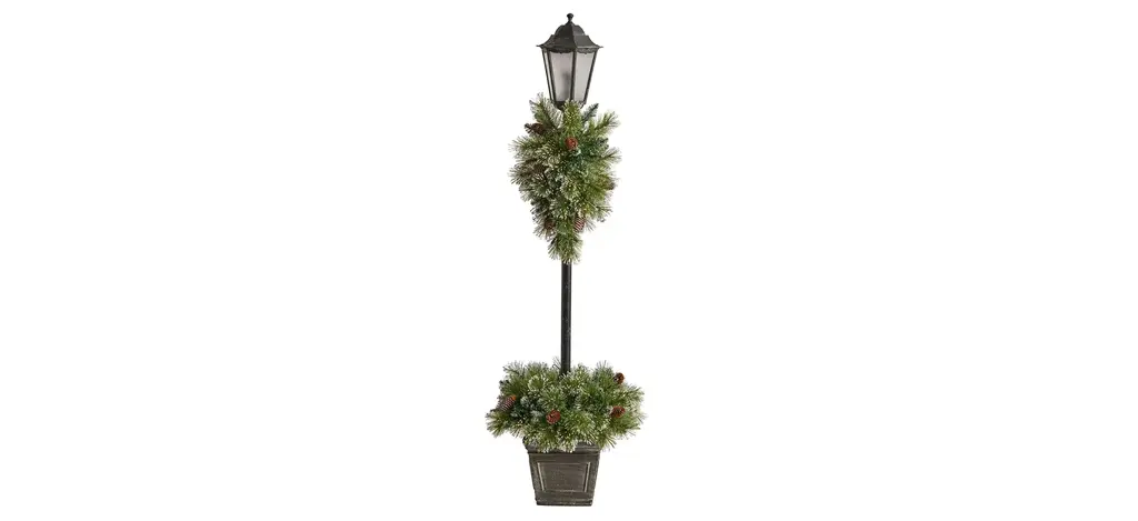 Make your holiday season a bit brighter by adding the 5' Holiday Pre-lit Decorated Lamp Post with Artificial Holiday Greenery in a Decorative Container that'll transport you to any holiday movie. Constructed from iron and in a sleek finish, illuminate any area with the 50 LED lights. For a festive touch, an evergreen Christmas-inspired wreath with pinecones and adorn the thin silhouette. Housed in a planter with artificial evergreens, this 5' tall lamp post will add holiday cheer to any bare corner of your space. Makes a fine gift as well.
