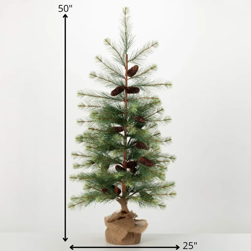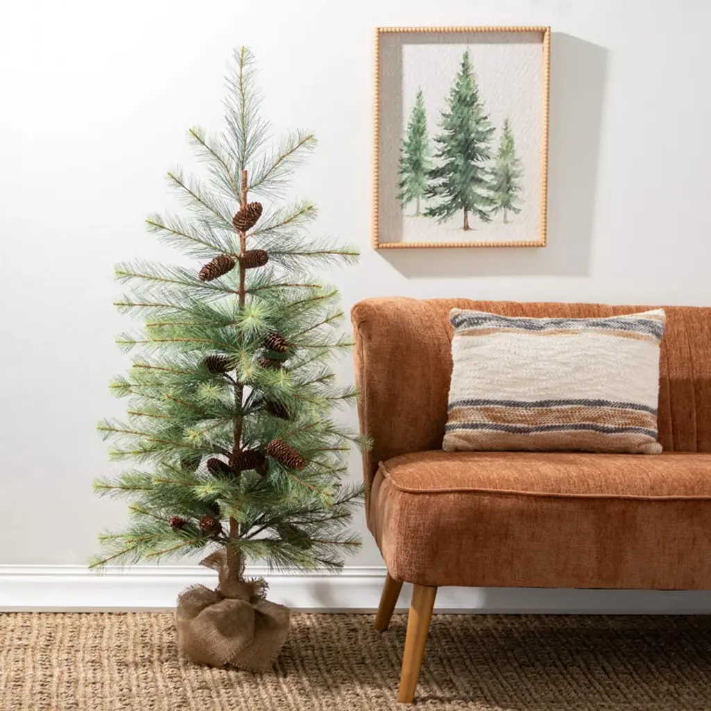 This small pine tree stands ready to add a touch of nature to your indoor space. The neutral evergreen tones and natural branch structure allow this little tree to remain on display year round, not just during the christmas holidays. Whether in a corner of your living room or dining room, its soft texture and rustic burlap planter wrap add a subtle dose of festive charm.