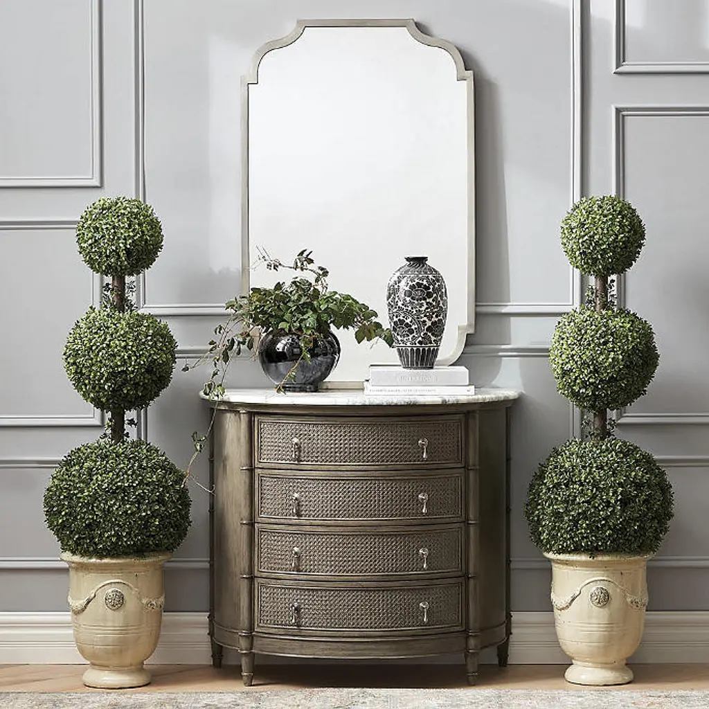 Our verdant, sculpted boxwood topiary makes a beautiful addition to any space, outdoor and even inside. Each lifelike plant is made of ultra-durable plastic and comes potted in a plastic liner, ready to be enjoyed for years in your favorite planter or urn. For outdoor or indoor use Plastic faux branches and greenery with wire Arrives in an 6" dia. x 6" H plastic nursery pot; ready to place in an urn or other container 100% UV protected Artificial dirt Fluff and shape greenery after unpacking Clean with soft, dry towel or duster Imported At Frontgate, our primary focus is quality. We guarantee that every product we sell will stand up to the supreme test – our customers' satisfaction. To learn more about our policies, visit our Shipping & Processing, Returns & Exchanges and Warranty & Price Guarantee pages.