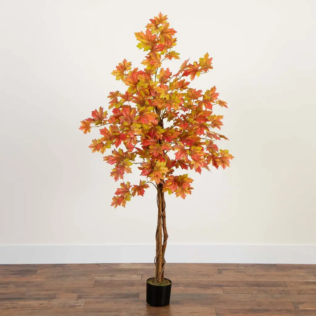 Welcome a cascade of fall hues with our faux deluxe maple tree. A palette of fiery reds, warm oranges, and sunny yellows and green graces each leaf, forming a lush canopy that captures the heart of fall. Crafted from high-quality materials, bend the branches to fit in your space. With a height of 5', the sturdy trunk rises from a black nursery pot, granting a solid foundation to this splash of seasonal color. Designed to stay vibrant and full, without the need for water or rake, this tree is the perfect, maintenance-free way to infuse your space with the essence of a fall day—any day of the year.