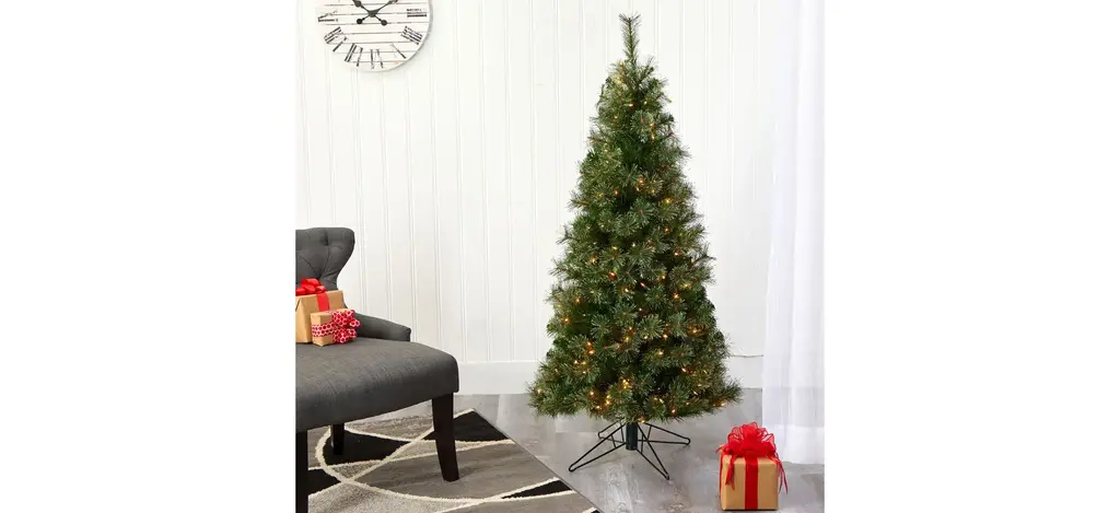 Create a traditional evergreen setting even in the tightest spaces with the help of this artificial Christmas tree. Entirely maintenance free, it features a tight, slimming silhouette made up of mountain greenery with 408 easy-to-bend branches for showcasing all your holiday ornaments and decorative accents. Arriving pre-strung with 250 warm white lights and carefully stabilized on a metal stand, this handsome 5' tall artificial Christmas tree will not only make decorating a breeze but ensure your home is always holiday-dressed for years to come.