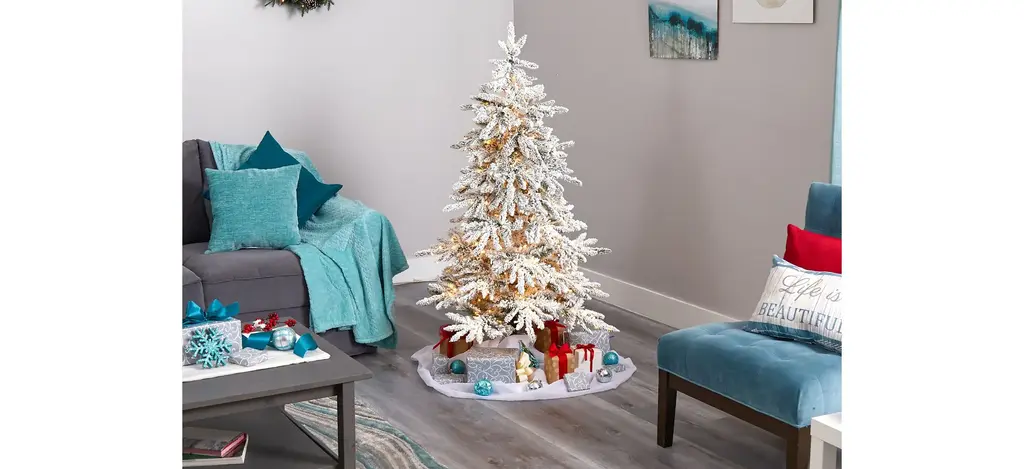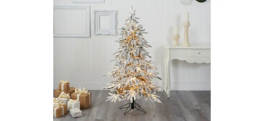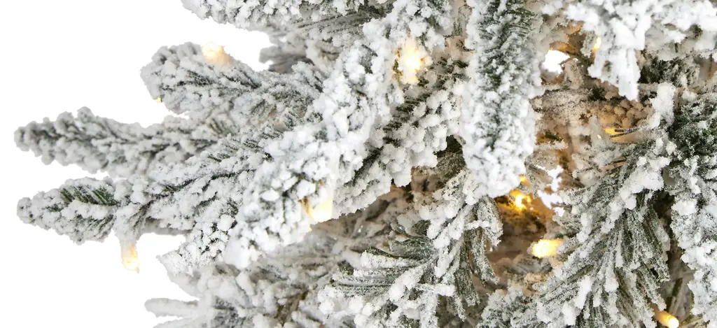 Evoke a winter-inspired Christmas this holiday with the help of this flocked artificial Christmas tree. Easy to build and entirely maintenance-free, it boasts a robust silhouette of seasonal evergreens, made up of 386 easy-to-bend branches for showcasing all your personalized ornaments - fully flocked with faux snow to create a picture-perfect setting. Arriving pre-strung with 650 clear LED lights, it also features 8 different light options (including Twinkle, Bursts, and Fade) to create a true holiday glow wherever displayed. Carefully stabilized on a metal stand, this enchanting 5' tall flocked artificial Christmas tree will undoubtedly be a focal point throughout the holidays, year after year.