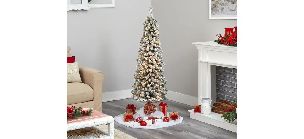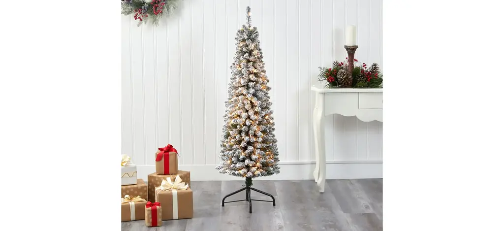Create a winter wonderland scene in a limited space environment with the help of this flocked artificial Christmas tree! Perfect for the smallest, tightest spaces because of its narrow, pencil-like design, it boasts a tight silhouette made up of 318 easy-to-bend branch tips for showcasing your favorite holiday ornaments, all beautifully flocked with faux snow to help evoke the ultimate winter setting. Arriving pre-strung with 200 clear LED lights to eliminate tangles and carefully stabilized on a metal stand, this space-saving 5ft. tall flocked artificial Christmas tree will not only make decorating a breeze but ensure your home is looking picturesque all throughout the holiday season - no matter your space situation. Artificial Christmas Trees are manufactured using synthetic materials, such as polyester material or plastic, and are well designed and constructed to be life-like in appearance. This item will need to be re-shaped when removed from the secure box to allow it to reach its fullest size.