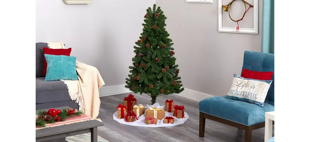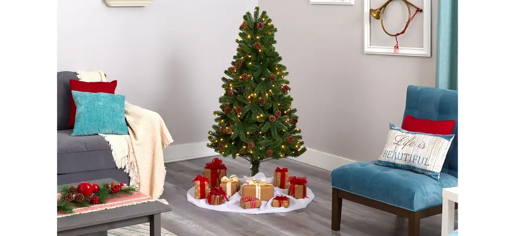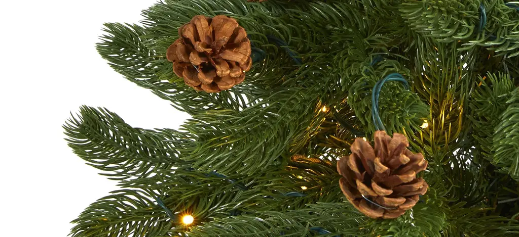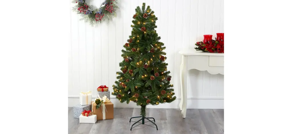 Complete a traditional Christmas scene with the help of this easy and effortless 5' pre-lit Rocky Mountain spruce artificial Christmas tree. Easy to build and completely maintenance-free, this realistic looking Christmas tree boasts a rich collection of evergreen foliage made up of 308 bendable branches, perfect for showcasing your favorite ornaments and accented throughout with faux pinecones that look incredibly lifelike. Arriving pre-strung with 100 clear LED lights to eliminate tangles and carefully stabilized on a metal stand, this evergreen 5' tall artificial Christmas tree will not only make decorating a breeze but ensure your home is always seasonally attired for years to come.
