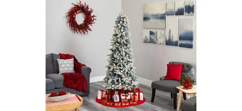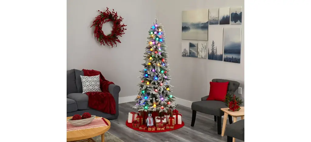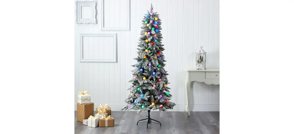 Evoke a winter-inspired Christmas this holiday with the help of this flocked artificial Christmas tree. Easy to build and entirely maintenance-free, it boasts a robust silhouette of seasonal evergreens, made up of 679 easy-to-bend branches for showcasing all your personalized ornaments - fully flocked with faux snow to create a picture-perfect setting. Arriving pre-strung with 75 multicolored globe bulbs to create a true holiday glow wherever displayed. Carefully stabilized in a decorative planter, this enchanting 6.5' tall flocked artificial Christmas tree will undoubtedly be a focal point throughout the holidays, year after year.