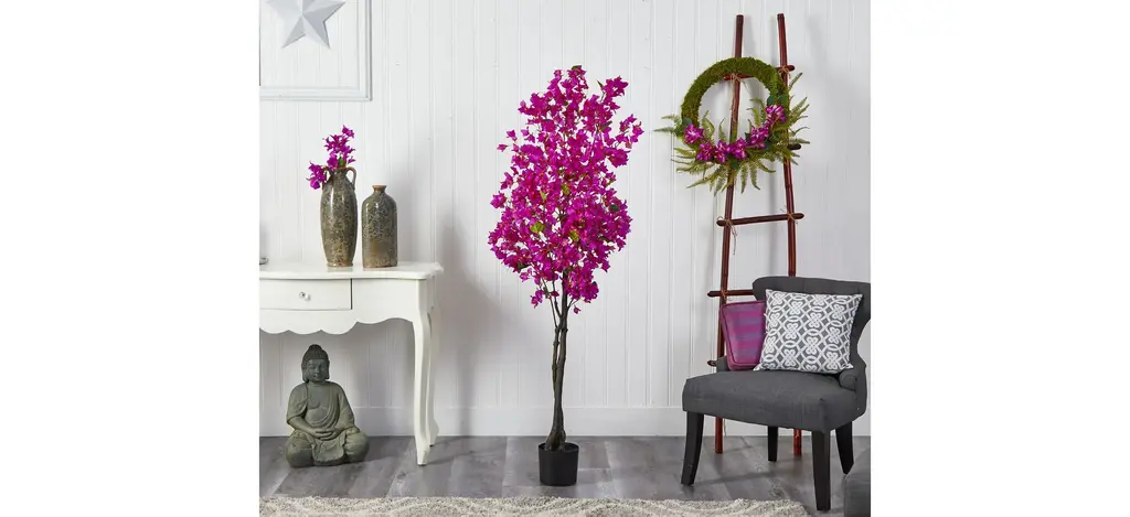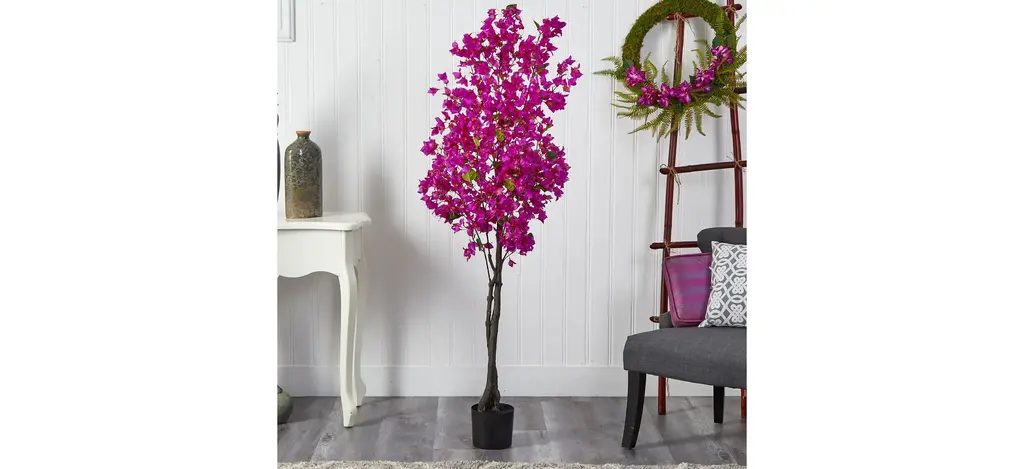 If you feel like showing your true colors, feel pretty in pink with this 6' Bougainvillea Artificial Tree. A palette of vivid colored flowers stem from a realistic brown trunk. Inspired by nature, the lifelike flowers will brighten and refresh any corner. Standing at 6', from a nursery planter, bring a colorful touch with vibrant flowers. Designed and approved by horticulturists, display in any room that needs to bloom such as bathrooms, home offices or kitchens. Artificial trees are manufactured using synthetic materials, such as polyester material or plastic, and are well designed and constructed to be life-like in appearance. Your artificial tree will look beautiful for years to come; simply wipe clean with a soft dry cloth when needed.