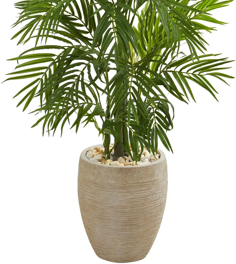 This faux golden cane palm lets you savor tropical ease no matter where you live. Impressively lifelike, it comes in an off-white planter filled with natural river rocks and is certain to become a focal point wherever you place it.