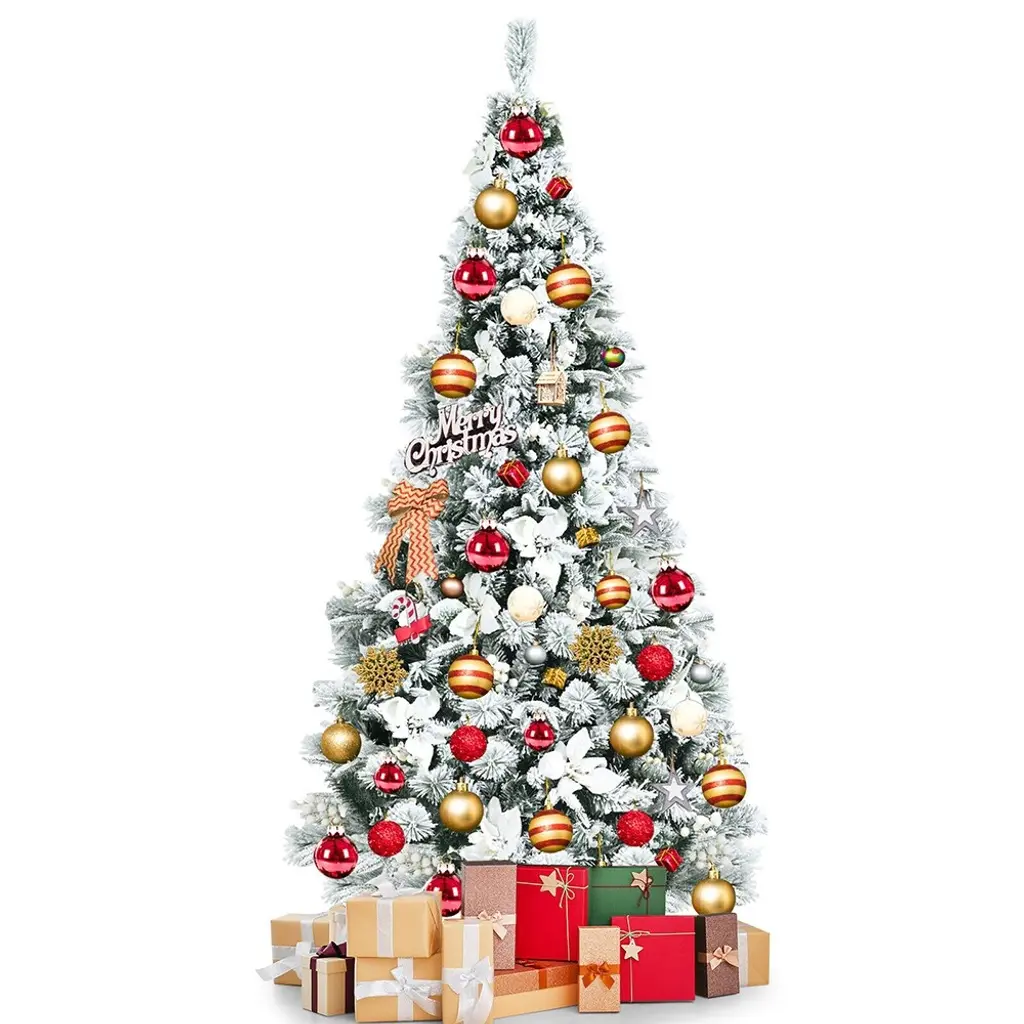 ▌ PRODUCT DETAILS: Description: Exquisite decoration for your happy holiday! The Christmas tree with strong festival favor features 631 branch tips, 312 pure white berries, and many big white flowers, which showcases a full-bodied and lush appearance and makes it an eye-catching addition to supermarket, living room, hotel or somewhere else. And delicately crafted with premium materials and a firm metal stand, the Christmas tree can withstand many Christmases and ensure long-time use. Each artificial Christmas tree is equipped with plenty of hinged branches with thick leaves, and you could adjust them flexibly so that the installation will be easy. Bring high-quality Christmas to you is our pursuit! Features: Heavily flocked snow gives the tree a full and healthy look A cross-shaped metal stand provides strong support Lush and full-bodied branch tips make the tree lifelike Easy to assemble and store with the hinged design Rich ornaments create a lively feel to your Holiday decor Specifications: Color: White Material: PVC& PE& Metal Height: 6FT Net Weight: 16lbs Number of Tips: 631 Package includes: 1 X Snow Flocked Christmas Tree 1 X Metal Stand