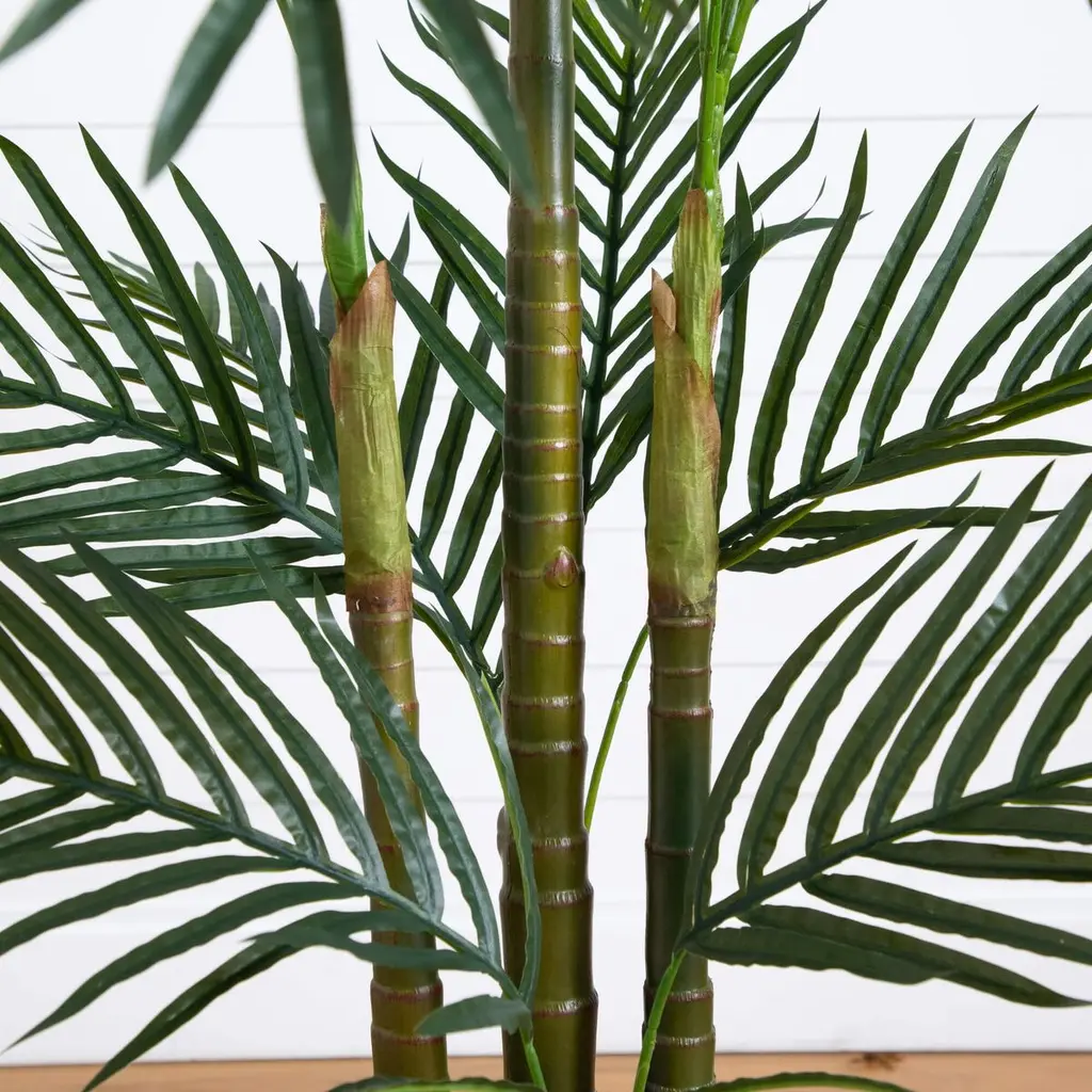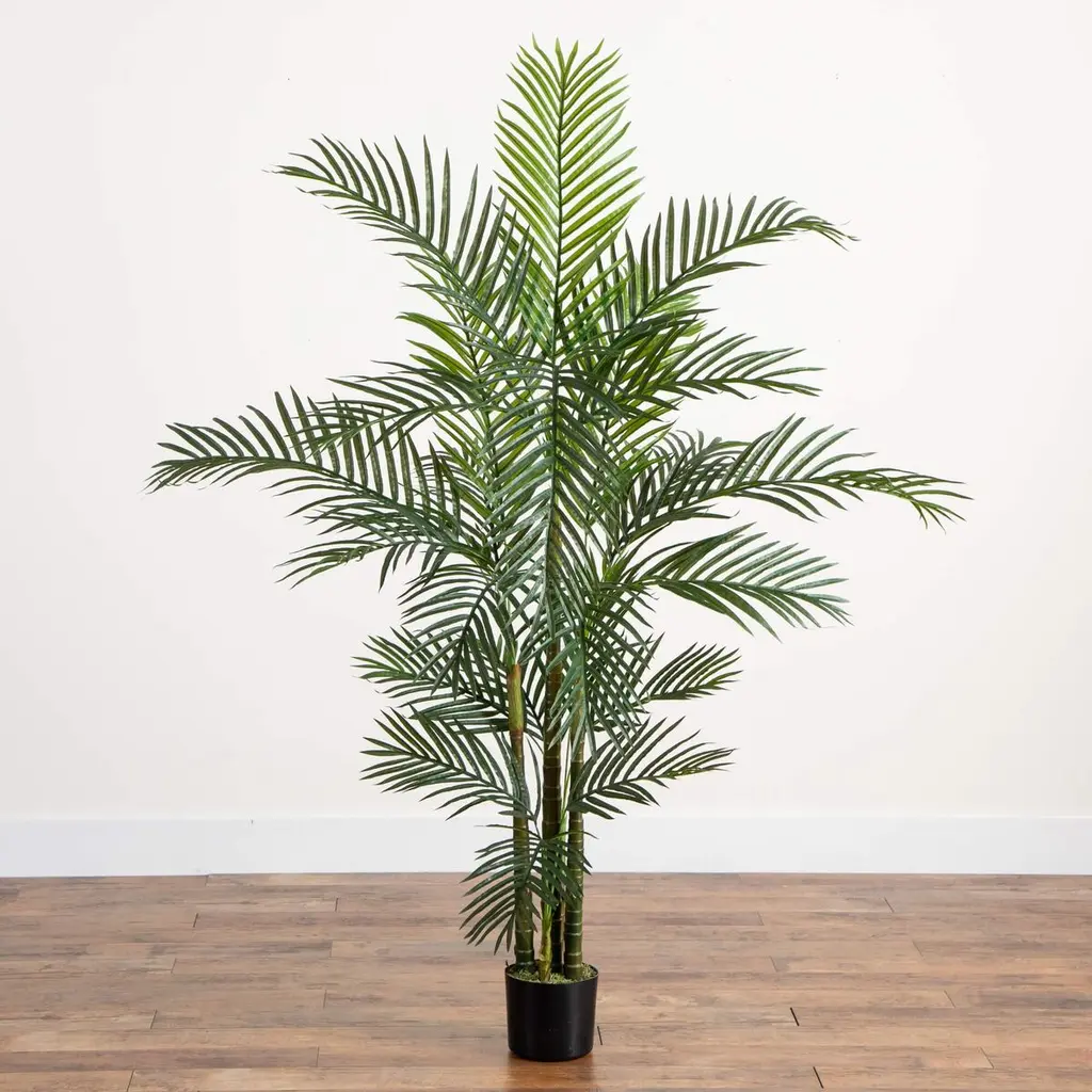 Capture those feel-good summer vibes with our UV resistant faux areca palm tree, the perfect piece for those who want the tropical feels without the hassle. Drawing inspiration from the sun-kissed Florida coast, our artificial areca palm boasts a full, lush canopy of fronds that sway in the breeze. Each branch is designed to be shaped, allowing for a personalized touch that makes your tree truly unique. This palm tree has been meticulously crafted through a special process to withstand the elements, making it suitable for both outdoor patios and indoor spaces. Standing proudly at 6-Ft and set in a nursery planter, it's a vibrant, maintenance-free addition to any area that could use a splash of green.