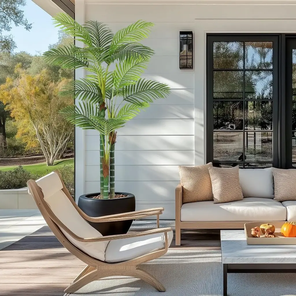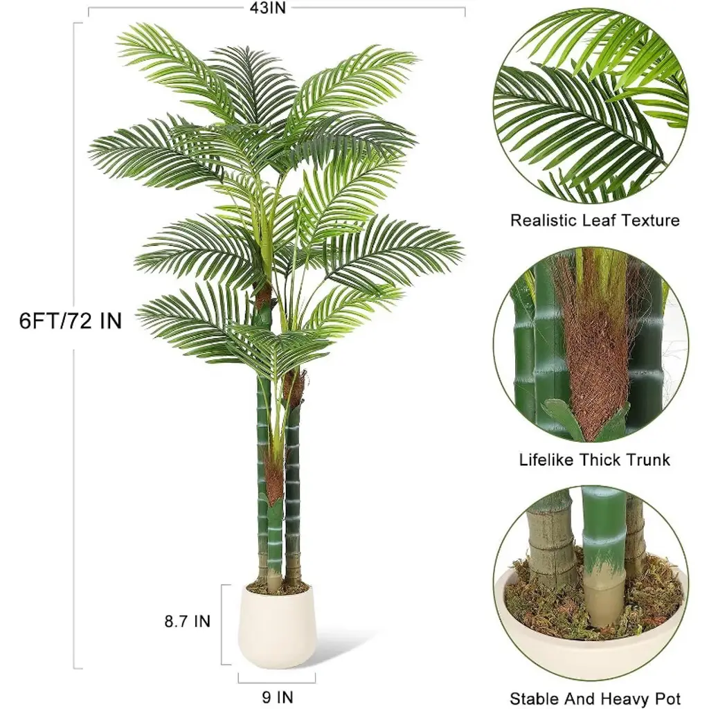 【Realistic Golden Cane Fake Trees】Palm tree large fake plant with white round planter, no matter where tall fake plant is placed in your home, it is perfect. products that include all the essential components: a fake tree, a white round planter and artificial moss. 【Adjustable Branch Designs】Constructed with stainless steel, our artificial trees exhibit exceptional flexibility and resistance to breakage. You can easily bend and adjust the branches according to your preferences, maintaining a consistent and picturesque shape. With leaves securely attached, these faux plants retain their beauty and integrity over time. 【Great Housewarming Choice】Artificial tree faux plants indoor are always dark green and full, with leaves never falling, maintenance free, no watering, no sunlight, or special care, will not fade or die, and will maintain its appearance and keep fresh all the year. 【Sturdiness Quality Stability】This tall artificial tree uses high-density plastic to make green leaves inside, and is equipped with real heald wire. It has been UV-proofed and is suitable for outdoor use, making the tall palm tree more realistic. Cement is added to the pot to increase stability, making the product stable and not easily blown down by the wind. 【Easy of Assembly & Clean】Our artificial tree for home decor indoor brings a refreshing touch of green to any space, capturing the beauty of summer and staying lush for years, unlike natural trees that wither in winter or scorch in summer. When there is much dust,just use a damp cloth or a duster to clean them. For outdoors, we recommend that avoid direct sunlight. Suitable for living room, dining room, office,or any building hall.