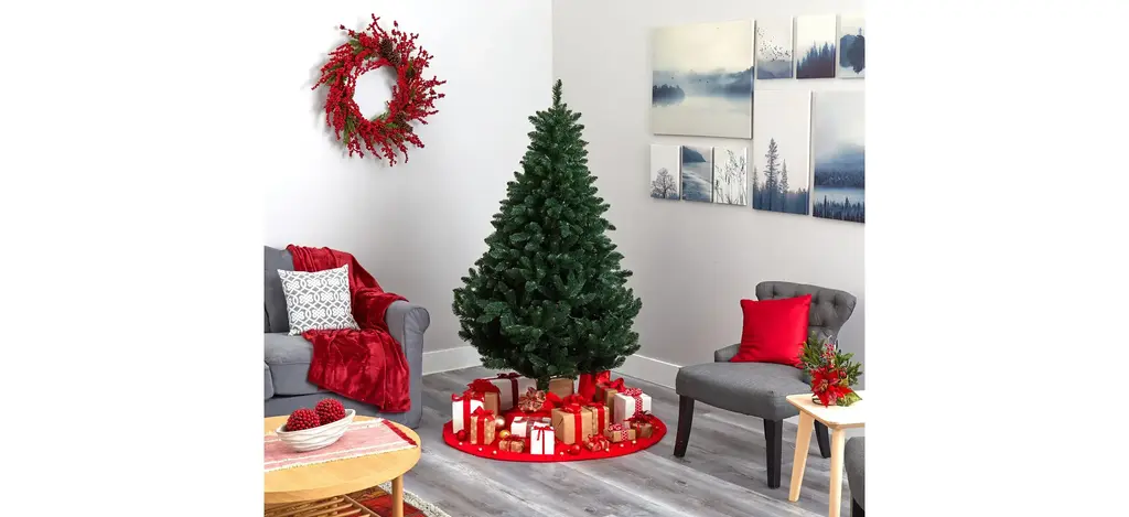 Create a traditional holiday scene in your home or office with the help of this artificial Christmas tree! Completely maintenance-free, this realistic looking fake Christmas tree boasts a full silhouette of seasonal evergreens made up of 838 bendable branch tips for decorating with your own personalized ornaments. Arriving pre-strung with 300 clear lights to eliminate tangles and carefully stabilized on a metal stand, this traditional 6' tall artificial Christmas tree will not only make decorating a breeze but ensure your home is always seasonally attired for years to come.