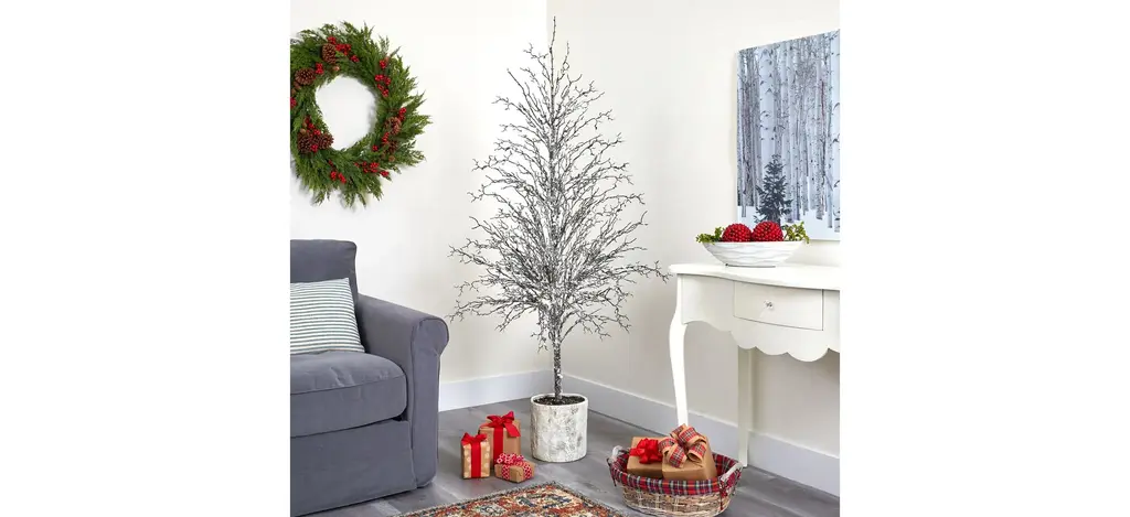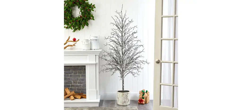 Create your own "Charlie Brown Christmas" with the help of this twig-like artificial Christmas tree. Sparse by design, this timid Christmas tree boasts slender, bendable branches for easy and effortless decorating and finished with a frosting of faux snow to evoke a winter wonderland setting. Standing 6' tall and stabilized in a decorative planter, this artificial Christmas tree would undoubtedly make a stunning addition to any winter decor scheme.
