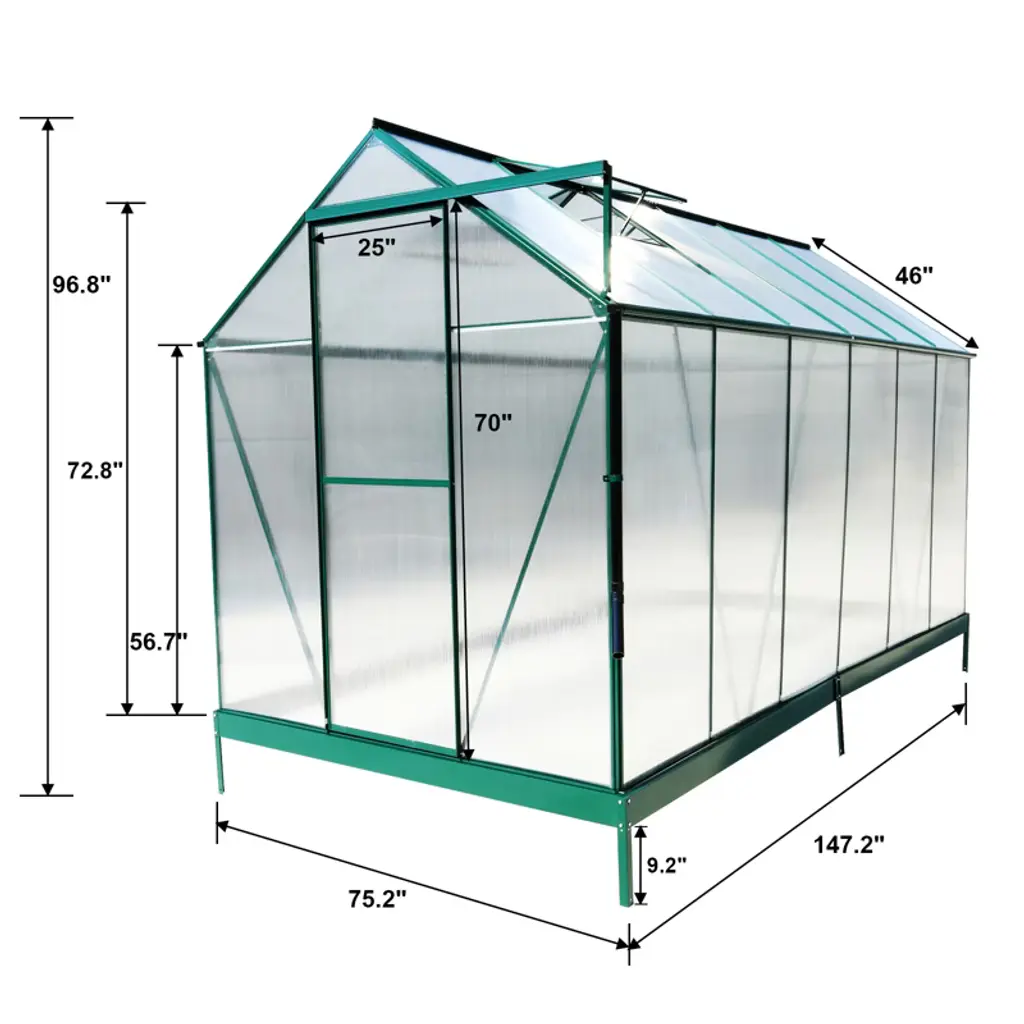 Description: Name: greenhouse Color: Green/White Cover Material:Polycarbonate (PC)/4mm Frame Material:Aluminum Frame/Steel base with ground anchor Finish:Aluminum Powder coated color Packing list: 1x greenhouse 1x accessory bag Durability and Stability: Constructed with powder-coated aluminum and a galvanized steel base, our outdoor greenhouse is water-resistant and built to last. Enjoy a sturdy design that can withstand various weather conditions.