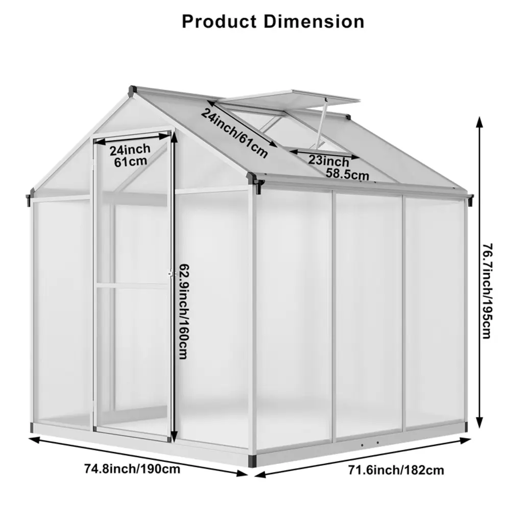 Grow Year-Round: Durable 6' x 6.25' Greenhouse Cultivate your dream garden with this resilient outdoor greenhouse featuring a lightweight aluminum frame (corrosion-resistant) and virtually unbreakable polycarbonate panels that optimize light transmission while blocking harmful UV rays. The adjustable 24"x23" roof vent ensures proper airflow to regulate temperature and humidity. Engineered for all-weather resilience¡ªwaterproof, wind-resistant, and insulated to protect plants in harsh conditions. Simple rivet-and-slide assembly requires no special tools. Ideal for extending seasons, growing veggies/herbs, or sheltering delicate flowers in yards, gardens, or patios. Transform your space into a thriving backyard oasis. Key Features: Dimensions: 6'D x 6.25'W x 6.50'H All-Weather Build: Aluminum frame + impact-resistant polycarbonate Smart Ventilation: Large adjustable roof vent Easy Setup: Rivet/slide system¡ªno complex tools UV Protection & Insulation: Shields plants while maximizing light Versatile Use: Vegetables, flowers, herbs, or seasonal starters