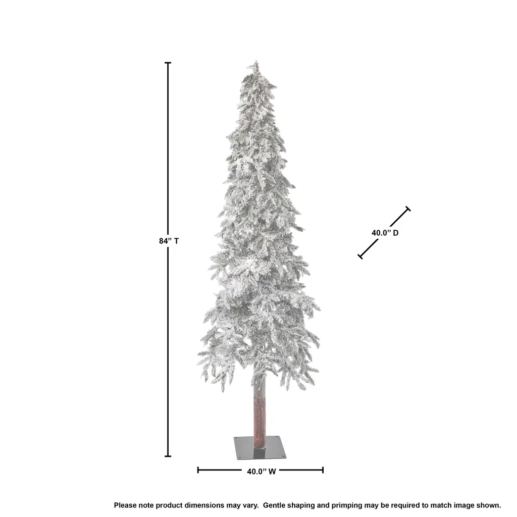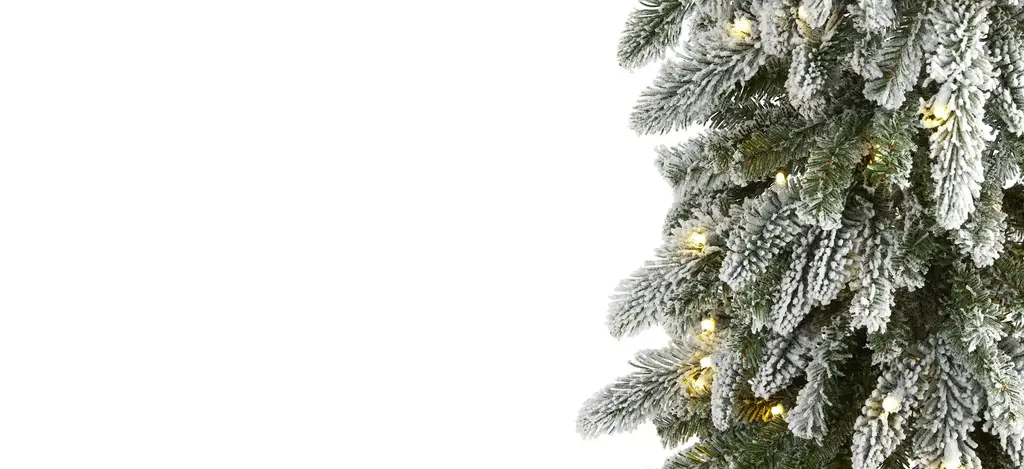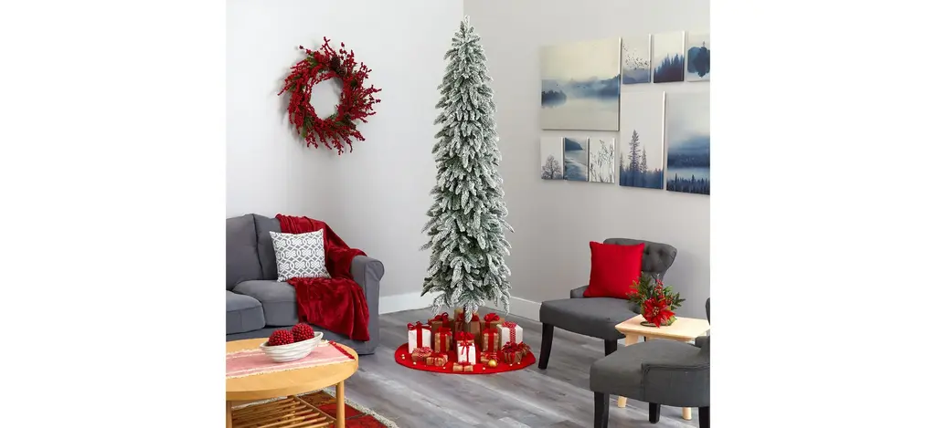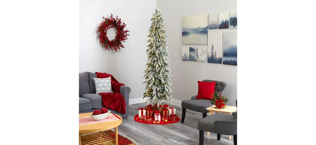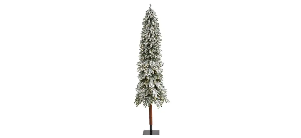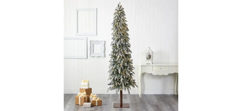 Set up the ultimate Christmas scene even in a limited space environment with the help of this flocked artificial Christmas tree. Completely maintenance-free, this winter-inspired artificial Christmas tree boasts a slim and slender silhouette made up of 877 easy-to-bend branches to showcase all your favorite holiday ornaments and comes beautifully flocked in a winter coating of faux snow to evoke the impression of freshly fallen snow. Arriving pre-strung with 350 clear LED lights to eliminate unsightly tangles and carefully stabilized on an extended faux wooden pole and metal stand, this snowy 7.5' artificial Christmas tree will undoubtedly transform your holiday decor, year after year.