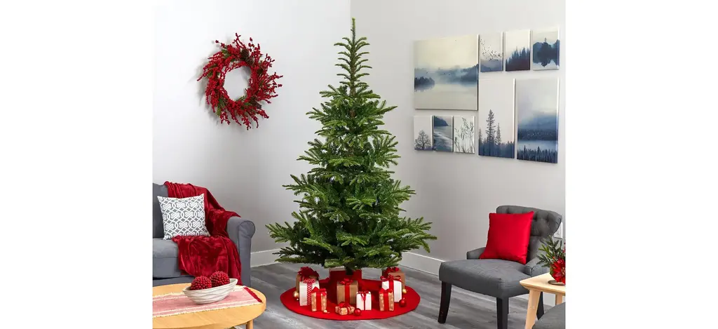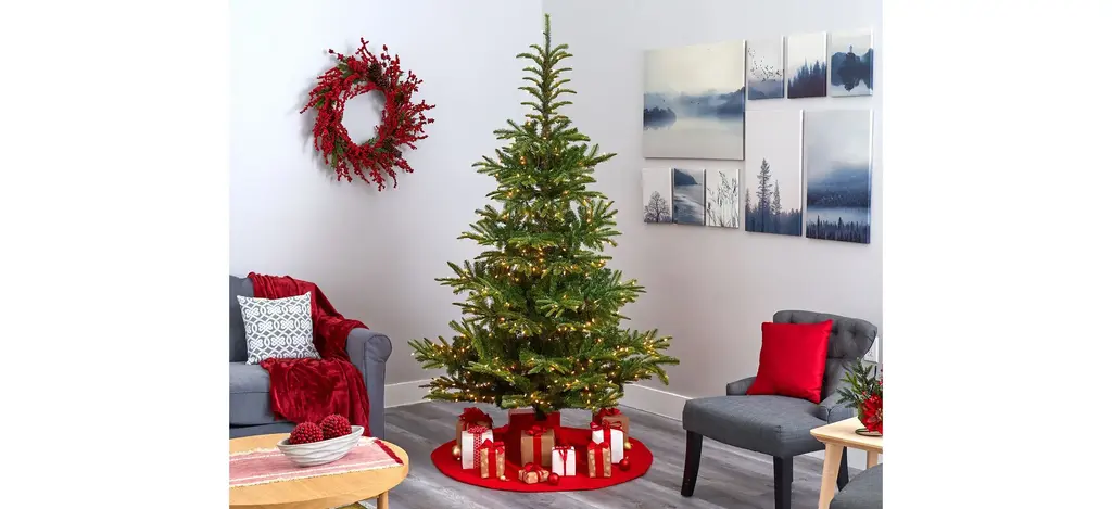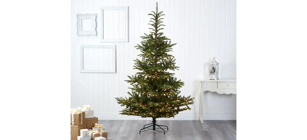 Evoke the holiday spirit throughout your home or office this season with this artificial Christmas tree. Easy to build and completely maintenance-free, this realistic looking Christmas tree boasts sparsely spaced tiers of seasonal evergreens made up of 1325 easy-to-bend branches, perfect for showcasing all your favorite holiday ornaments and decorative accents. Arriving pre-strung with 550 clear lights to eliminate tangles and carefully stabilized on a metal stand, this modern 7.5' tall artificial Christmas tree will not only make decorating a breeze but ensure your home is always seasonally attired for years to come.