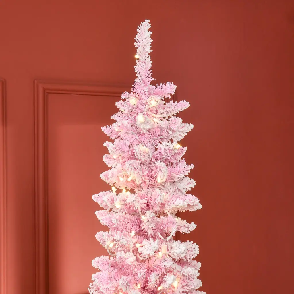 7.5ft Prelit Snow Flocked Artificial Auto Open Christmas Tree With Pencil Shape, Pine Realistic Branches & Warm White Led Lights - Pink - 7.5 Foot
