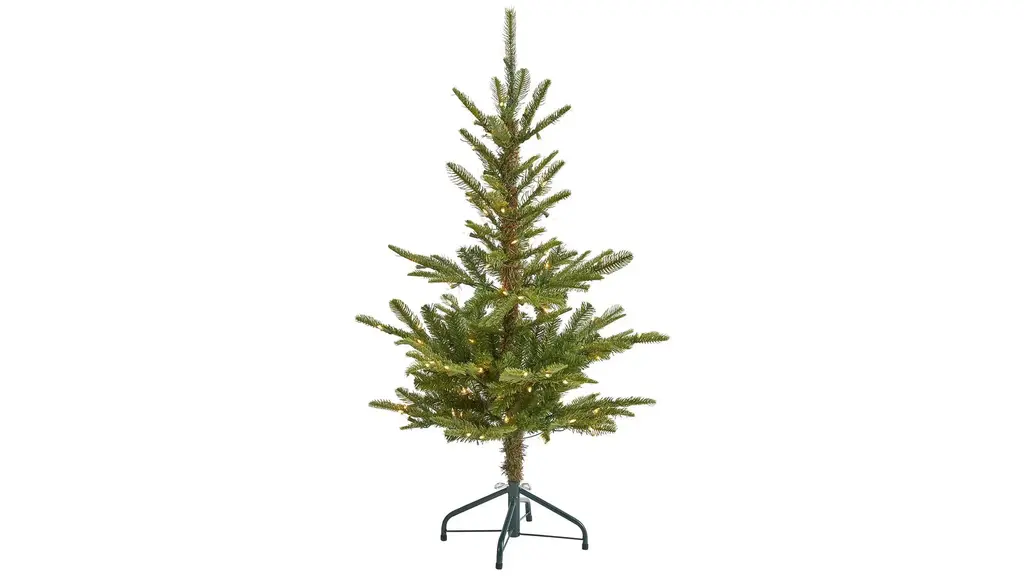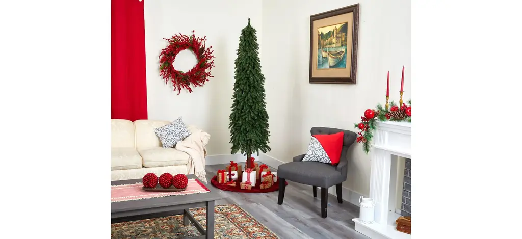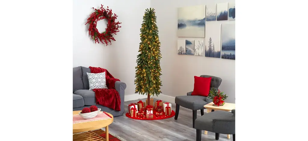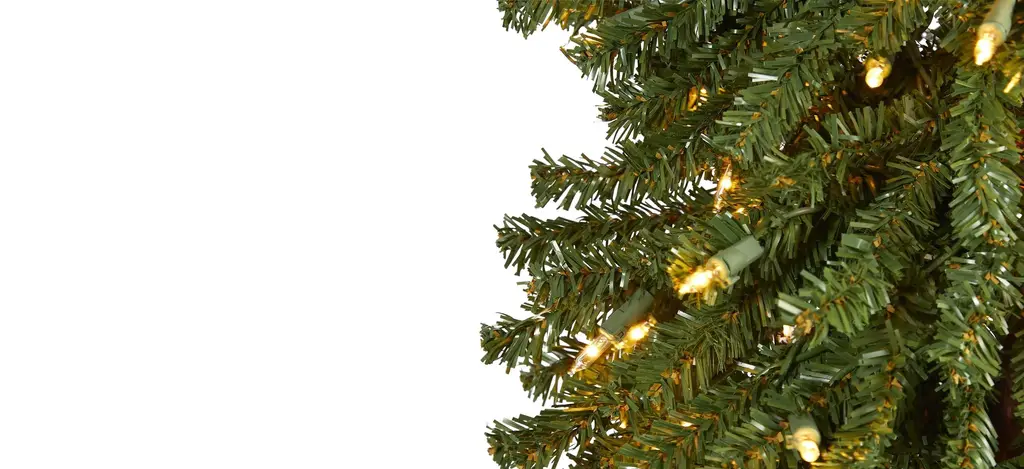 Create a traditional evergreen setting even in the tightest spaces with the help of this artificial Christmas tree. Entirely maintenance free, it features a tight, slimming silhouette made up of mountain pine greenery with 950 easy-to-bend branches for showcasing all your holiday ornaments and pre-strung with 400 lights to help eliminate the hassle of tangles or knots. Guaranteed to make holiday decorating stress-free, this slim-fitting artificial Christmas tree stands 7' tall and comes stabilized on a wooden pole and metal base for effortless display all season long.