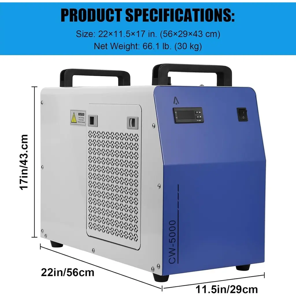 The CW-5000 chiller is designed for laser cutting and engraving machines, utilizing R134a refrigerant for fast cooling. It features a large 1.85 gallon water tank with a closed design, premium brass water inlet and outlet, dual cooling fans, precise temperature control, and fault alerts for protection. Key Features: