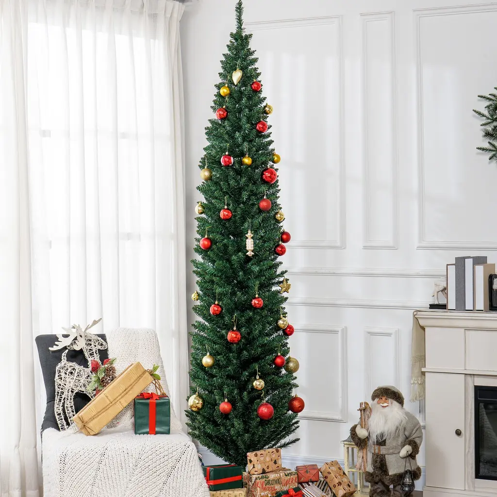 Warm tips: Product after-sales guide 🚀Thank you for purchasing our products!Please do not return the product in case of problems. Please take a photo and send it to us, we will quickly process and provide a reasonable solution. Thank you for your cooperation! 🙏 Seriously No-Hassle: If you're looking for an unlit artificial Christmas tree that holds its shape and is a safer option for your family, look no further than this pencil Christmas tree. No more crowded farms (yech), no more allergies (phew), no fires, no watering, no needles, you get the idea. Make Fluffing Fun: The only time you're really spending is fluffing the Xmas tree, which can be a family-friendly way to decorate and share some hot chocolate. Make it a game: race against the clock, compete to see who fluffs the most, and create an obstacle course. The options are nearly endless. More Ambience Is Better: A flame-retardant realistic Christmas tree will give you some extra peace of mind if you have to put your tree next to your fireplace. Of course, it's a great ambience on its own, but a fireplace... I mean, come on. Easy, Easy, Easy: Here's where the rubber meets the road: you get a slim cardboard box (easy storage). You get several pieces to put together (easy assembly). You get a lightweight and strong base. Even though it's a fake Christmas tree, we've got you covered start to finish. Decor Christmas Tree Info: Overall tree dimensions (including base): Dia 21.75" x 8' H. Tip Count: 618. You'll spend about 30-40 minutes fluffing this tree.