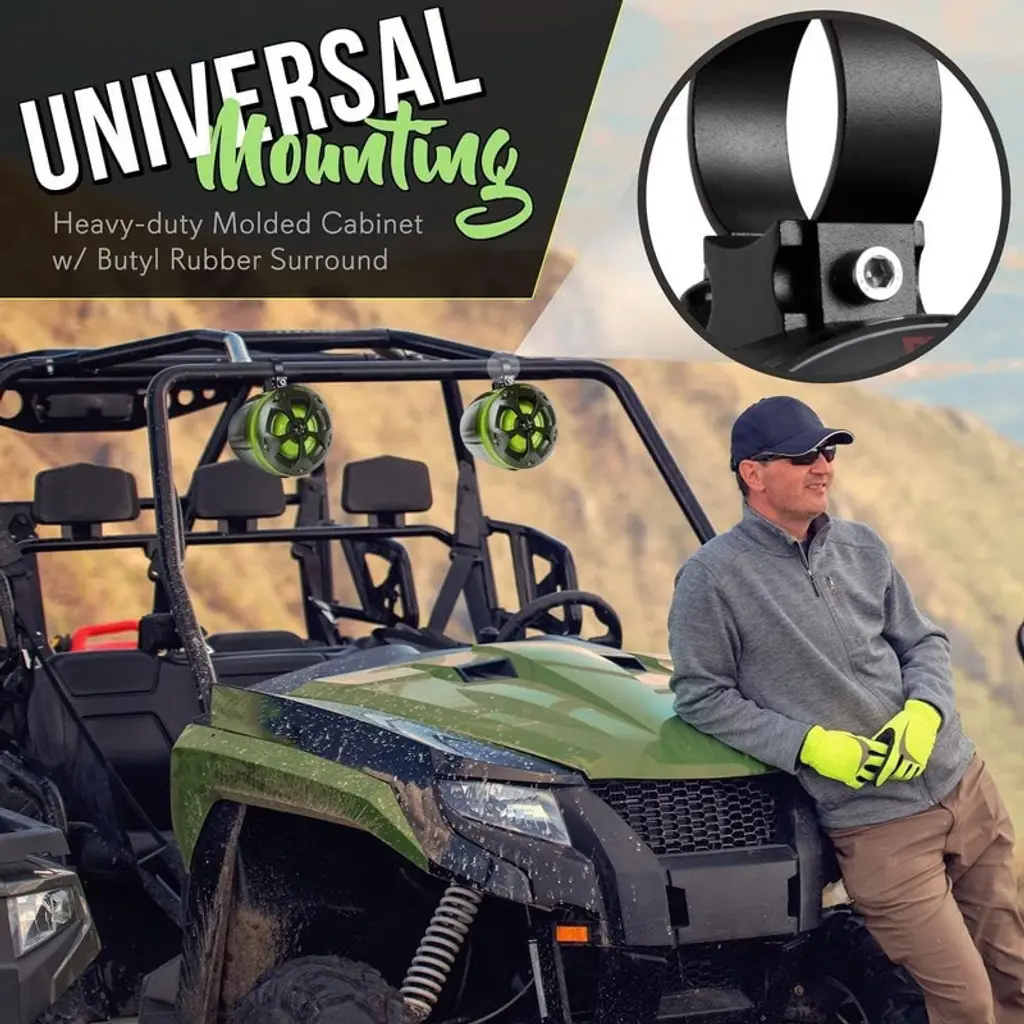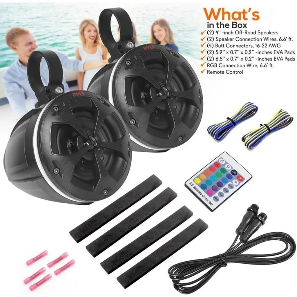 The Pyle Waterproof Off-Road Bluetooth Speaker System (PLUTV44BTR) is perfect for enhancing your outdoor adventures with high-powered audio and vibrant RGB lighting. Designed for use with ATVs, UTVs, and other off-road vehicles, these speakers feature marine-grade waterproof construction and weather-resistant housing. The system offers Bluetooth wireless music streaming, allowing you to easily connect your favorite devices. With a built-in digital sound processing amplifier, this system provides full-range stereo sound and impressive bass response. The rugged universal mount bracket makes installation easy on roll-bars or roll-cages, ensuring a secure fit for any vehicle.