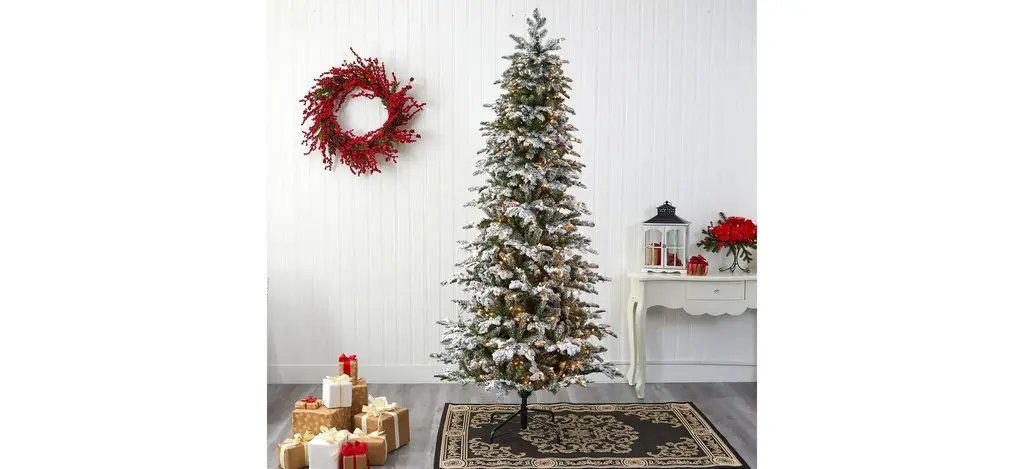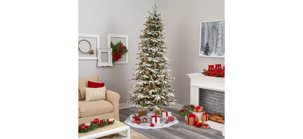 Create a winter-inspired Christmas scene without the hassle of upkeep or maintenance with the help of this flocked artificial Christmas tree. Perfect for tight, narrow spaces because of its slim silhouette, it boasts evergreen foliage made up of 2593 easy-to-bend branch tips for showcasing your favorite holiday ornaments- all fully flocked with faux snow to create a winteresque Christmas. Arriving pre-strung with 650 clear LED lights to eliminate tangles and carefully stabilized on a metal stand, this flocked 8ft. tall artificial Christmas tree will not only make decorating a breeze but ensure your home is holiday-ready for years to come. Artificial Christmas Trees are manufactured using synthetic materials, such as polyester material or plastic, and are well designed and constructed to be life-like in appearance. This item will need to be re-shaped when removed from the secure box to allow it to reach its fullest size.