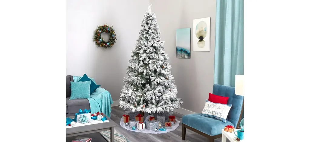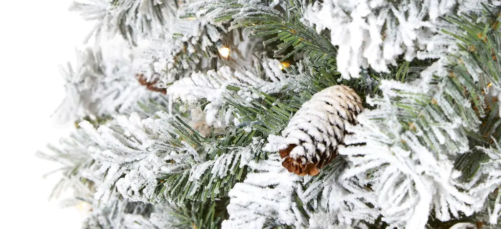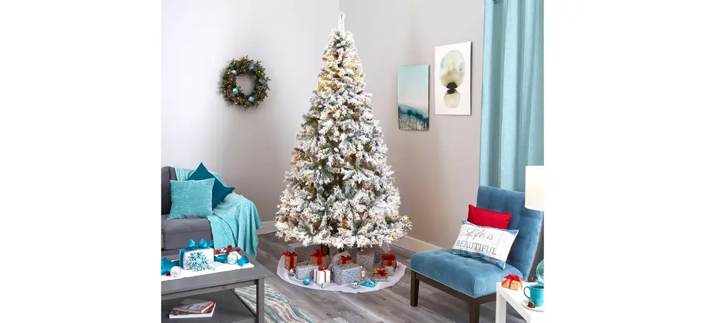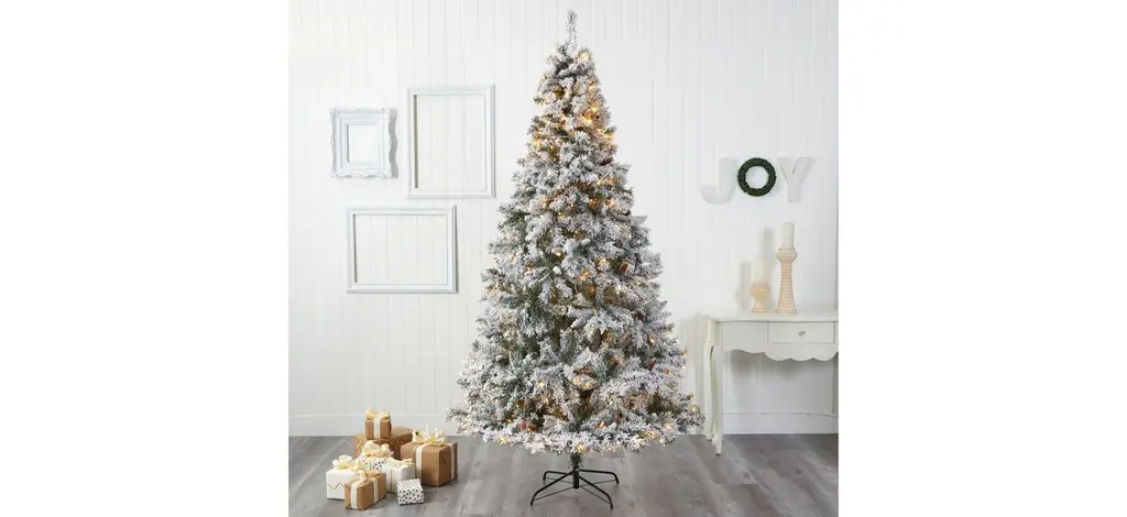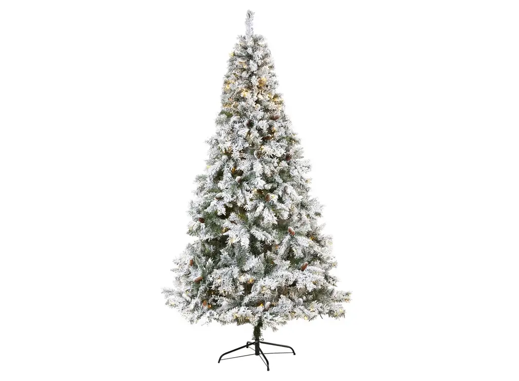 Create a picturesque Christmas this holiday season with the help of this 8' pre-lit flocked white river mountain pine artificial Christmas tree. Easy to set-up and entirely maintenance-free, this winter-inspired Christmas tree boasts a robust collection of realistic looking foliage consisting of 1260 easy-to-bend branches for showcasing holiday accents and accented throughout with faux pinecones that look incredibly realistic; it comes finished with a light flocking of faux snow to evoke the ultimate winter wonderland. Arriving pre-strung with 500 clear LED lights for stress-free decorating and carefully stabilized on an accompanying stand, this impressive 8' tall flocked artificial Christmas tree will undoubtedly transform any home or office into a joyous holiday setting for years to come.