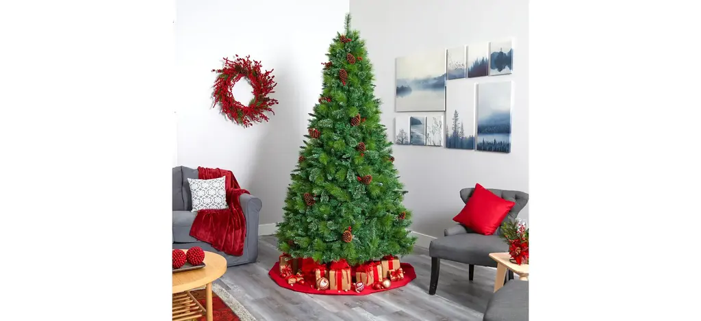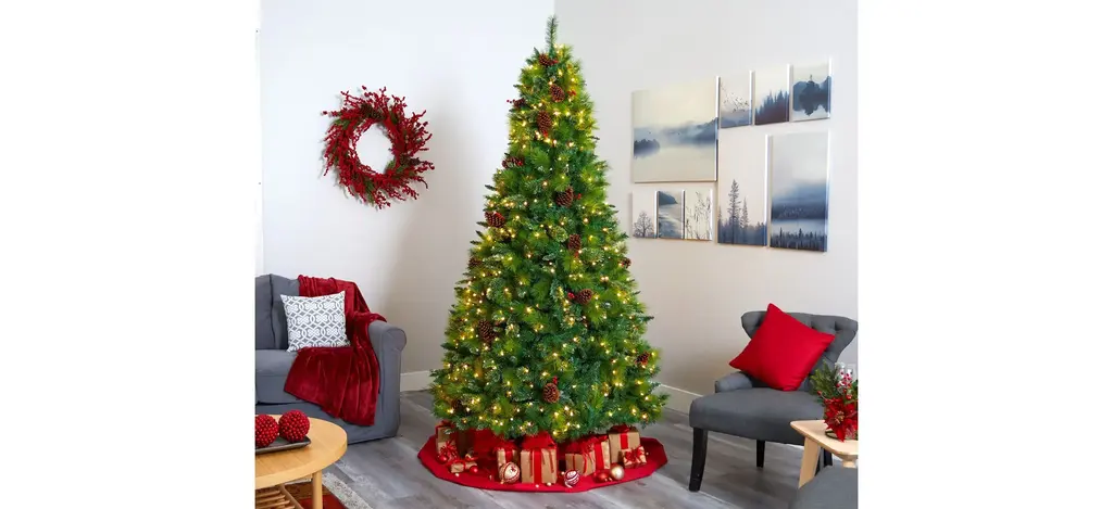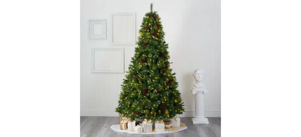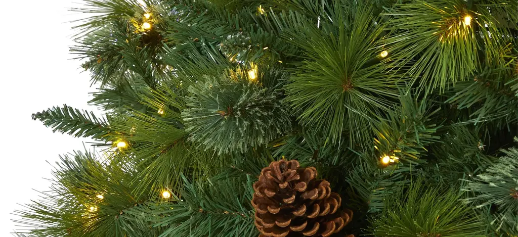Spread seasonal cheer throughout even the smallest of spaces with the help of this 8' pre-lit Montana mixed pine artificial Christmas tree. Entirely maintenance-free, this traditional looking Christmas tree boasts a full, classic silhouette made up of 1750 easy-to-bend branches for showcasing holiday ornaments, accented throughout with faux pinecones and holly berries that look incredibly lifelike. Arriving pre-strung with 700 clear LED lights to eliminate tangles and carefully stabilized on an accompanying base, this impressive 8' tall artificial Christmas tree will complete your holiday decor - year after year.