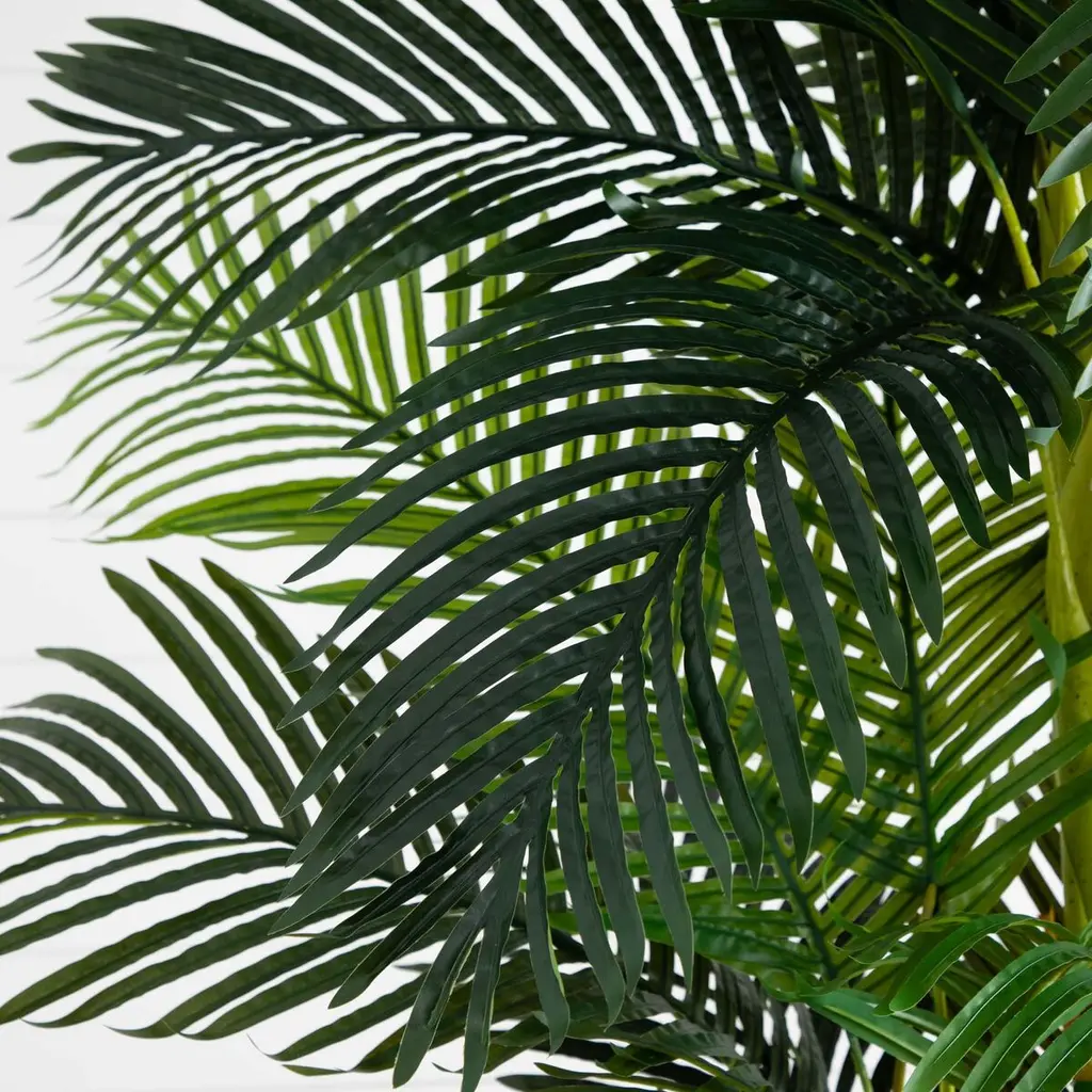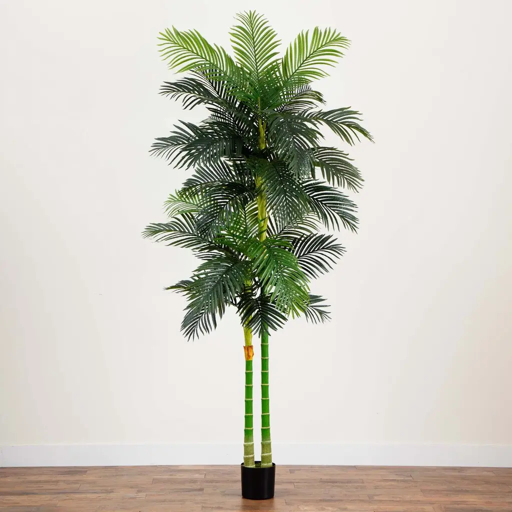 Take your space to new heights with the exotic charm of the artificial Double Golden Cane Palm Tree. Drawing inspiration from the idyllic Floridian coast, this tree invites a vacation-worthy ambiance into your home, complete with oceanic allure. Our horticulturists, well-versed in the beauty of seaside landscapes, have meticulously captured the essence of the palm with detailed fronds in various shades of green and authentic touches in the double trunk's design. Customize the look by shaping the branches to your preference for a truly unique display. At a towering 9' from a nursery planter, this palm is perfect for areas with high ceilings, bringing a piece of the tropics to you.
