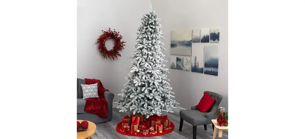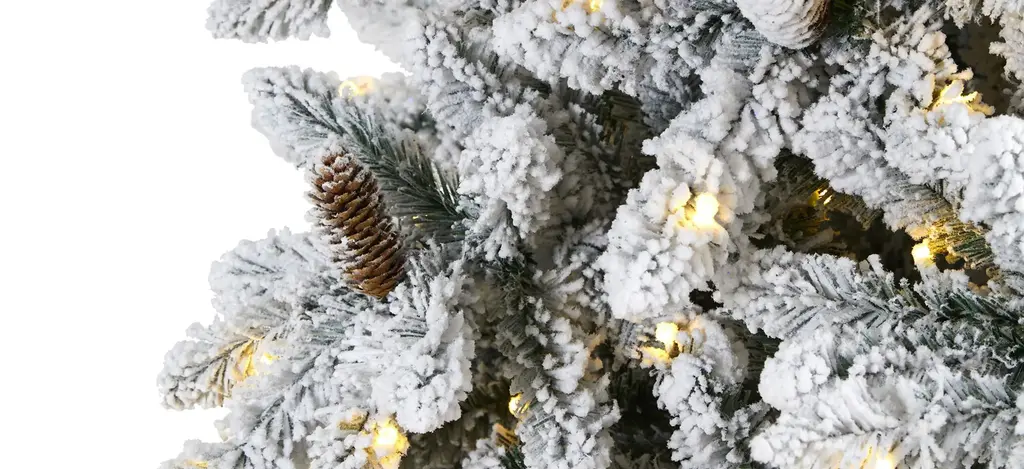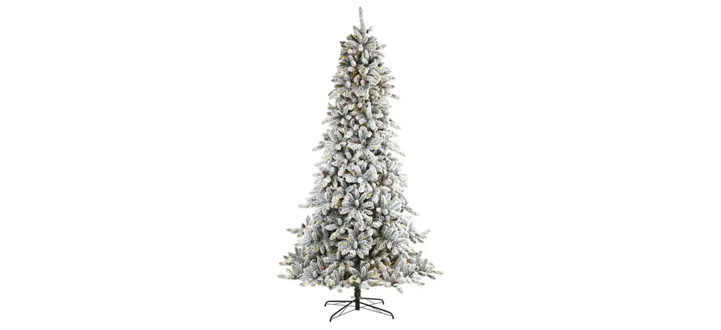 Create a picture-perfect Christmas setting this year with the help of this 9' pre-lit flocked Livingston fir artificial Christmas tree. Easy to set-up and entirely maintenance-free, this winter-inspired Christmas tree boasts robust tiers of realistic looking foliage made up of easy-to-bend branches for showcasing your own personalized ornaments and holiday accents - all lightly frosted with faux snow, creating the ultimate winter wonderland. Arriving pre-strung with 650 clear warm LED lights to eliminate tangles and carefully stabilized on a metal stand, this impressive 9' tall frosted artificial Christmas tree will undoubtedly transform any home or office into a joyous holiday setting for years to come.