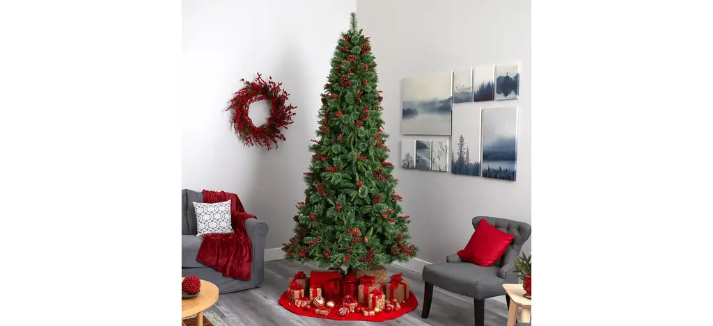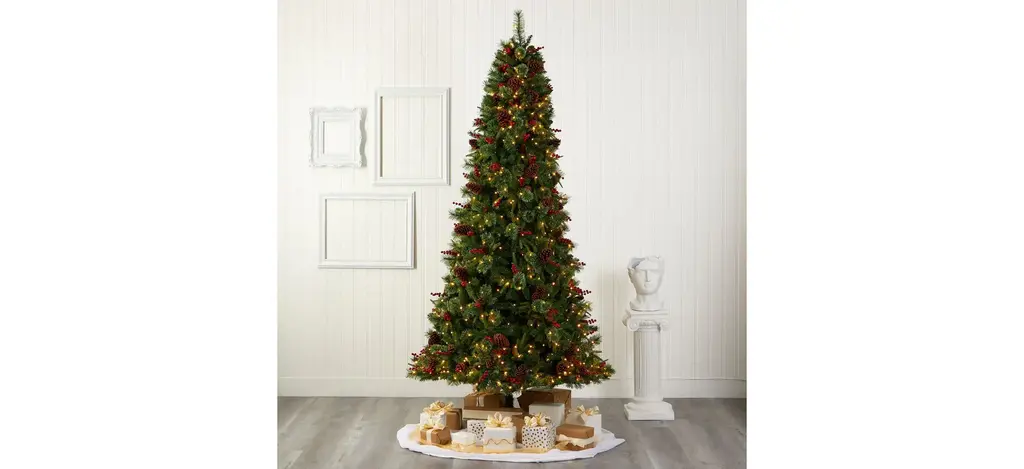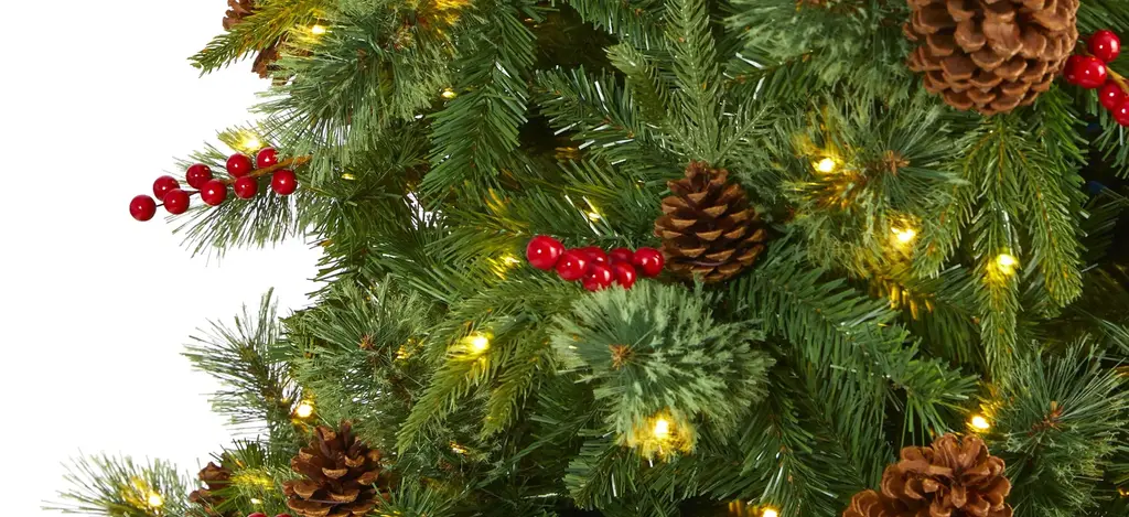 Create a picture-perfect Christmas setting in your home or office with this festive 9' pre-lit Norway mixed pine artificial Christmas tree. Easy to build and completely maintenance-free, this realistic looking Christmas tree boasts a mixed collection of pine foliage made up of 2026 easy-to-bend branches, accented throughout with faux pinecones and holly berries that look incredibly realistic. Arriving pre-strung with 650 clear LED lights to eliminate tangles and carefully stabilized on a metal stand, this impressive 9' tall artificial Christmas tree will not only make decorating a breeze but ensure your home is always seasonally attired for years to come.