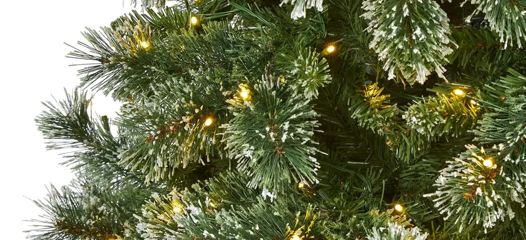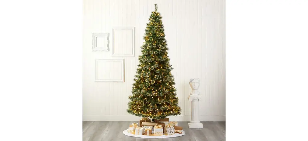 Create the ultimate holiday scene in your home or office with the help of this evergreen 9' pre-lit Wisconsin slim snow tip pine artificial Christmas tree. Entirely maintenance-free, this realistic looking Christmas tree boasts a rich collection of pine foliage made up of 1212 easy-to-bend branches to hang all of your favorite holiday ornaments. Arriving pre-strung with 800 clear LED lights to eliminate tangles and stabilized on a metal stand, this impressive 9' tall Christmas tree will not only make holiday decorating a breeze but ensure your home is always holiday-dressed for years to come.