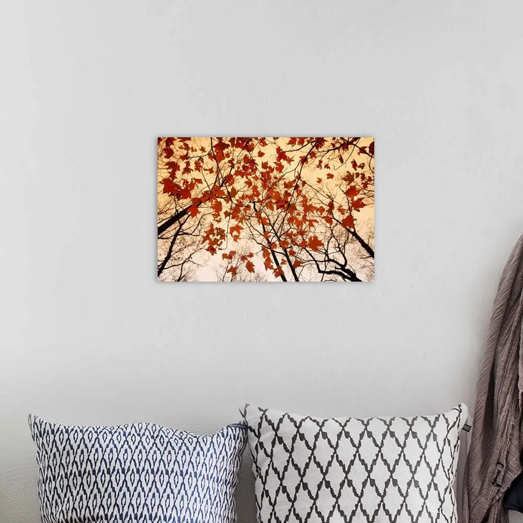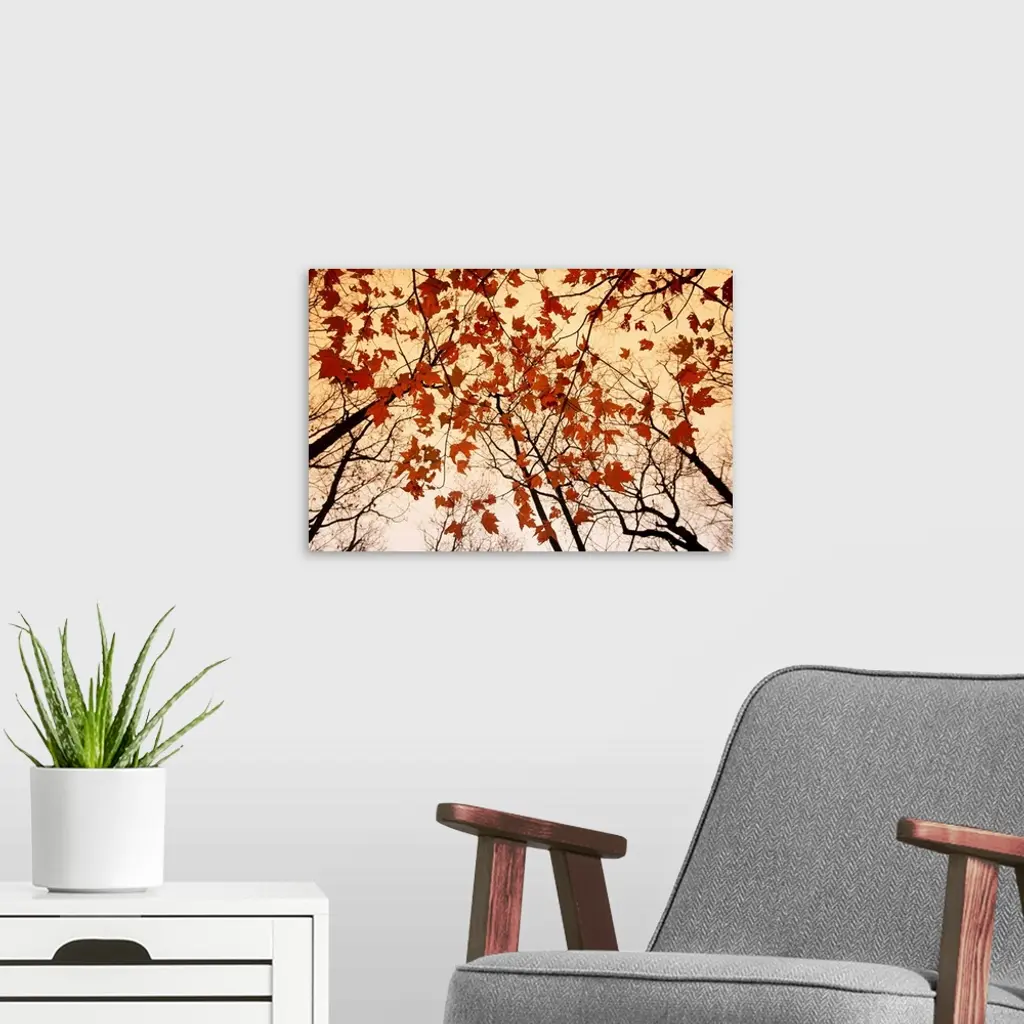 From the National Geographic Collection the branches of trees reach upward while the last leaves of fall cling to tree branches in the foreground.